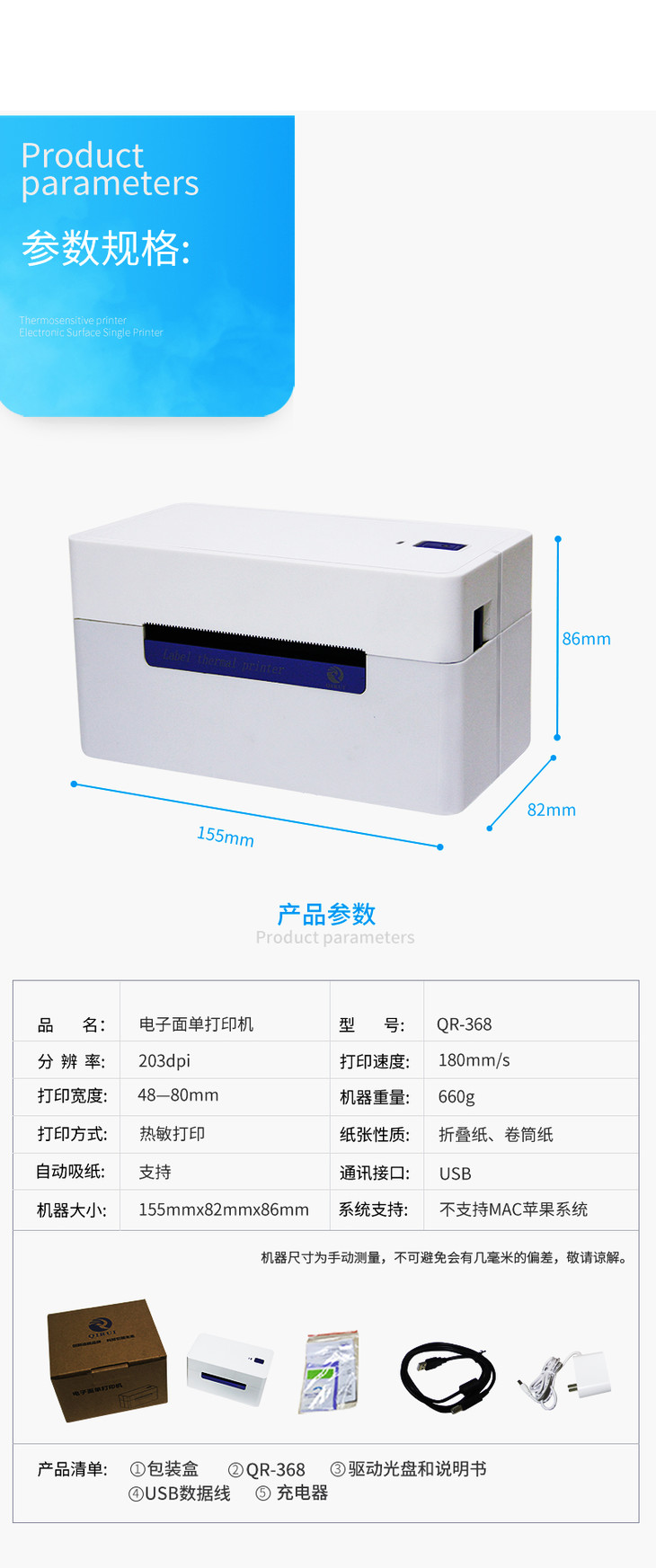 【全国包邮】启锐QR-368蓝牙热敏标签电子面单3寸打单 一联单快递单打印机 可连接快宝驿站 快递员app