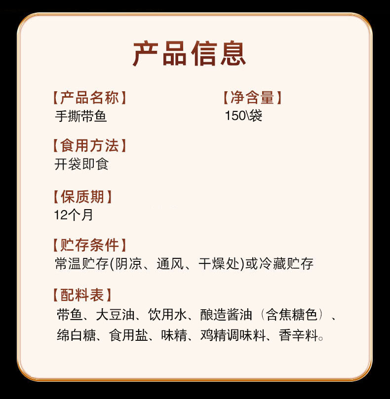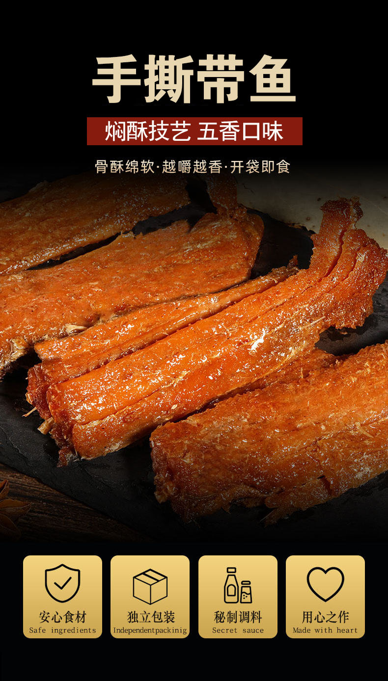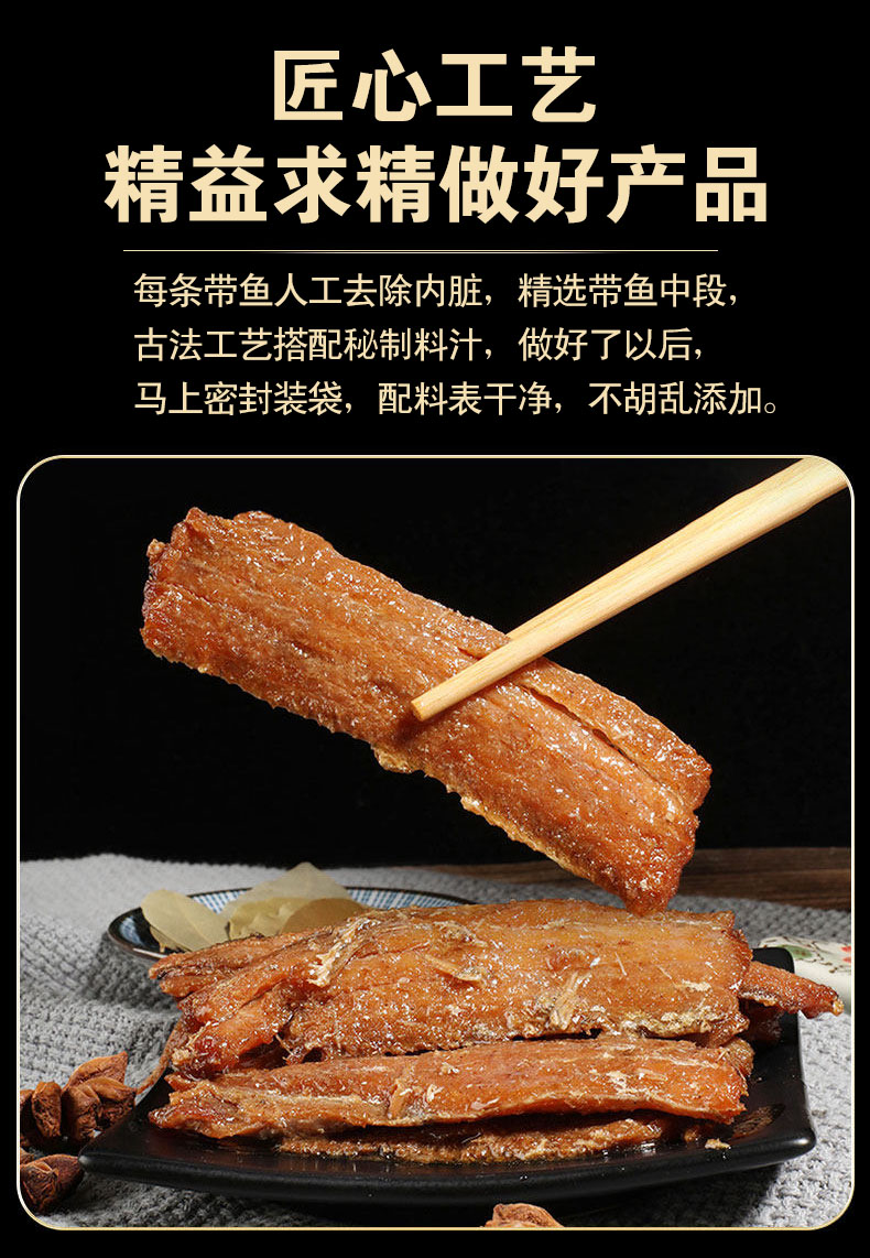 老北京手撕带鱼,18袋组合,精选黄海冷水带鱼中段,古法工艺搭配多味香辛料,配料干净,口感丝丝入味、肉质饱满、香味浓郁、好吃好嚼,开袋即食,吃法多样,鱼刺、鱼骨已酥软,放心吃M