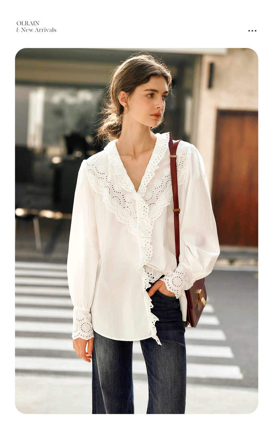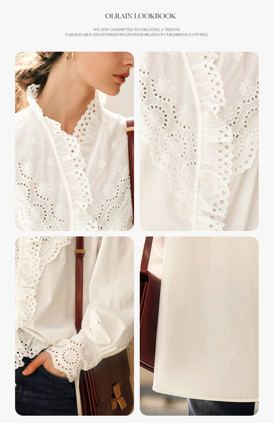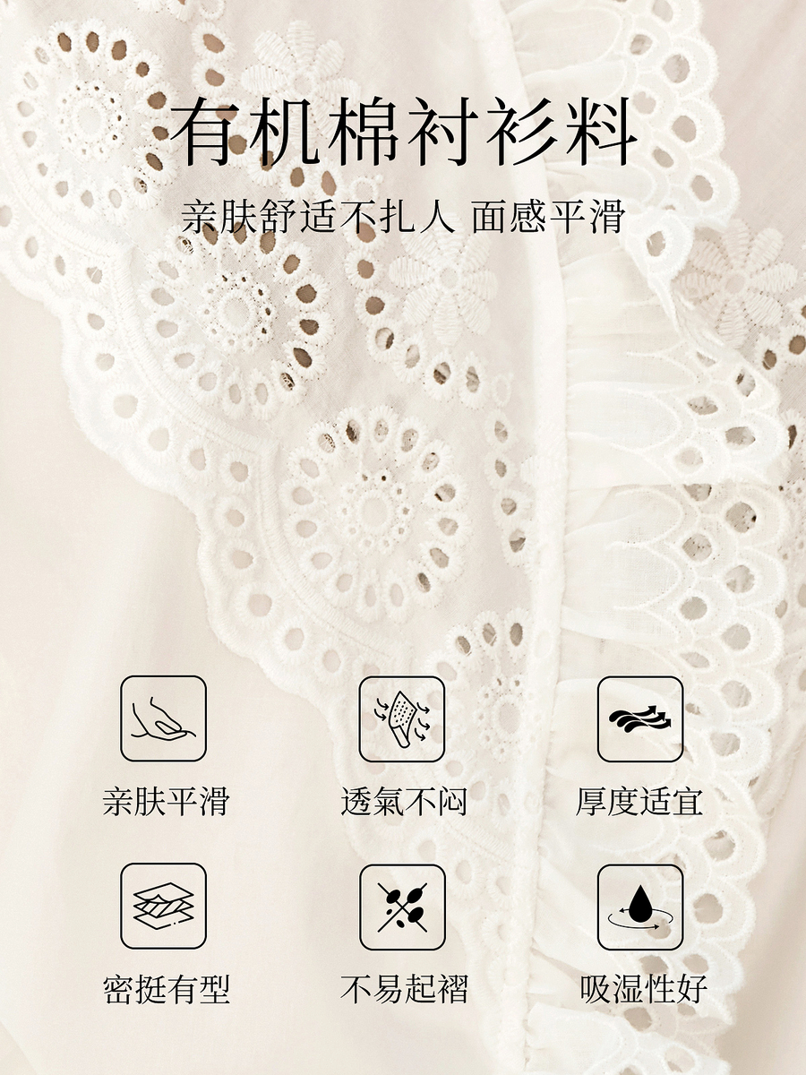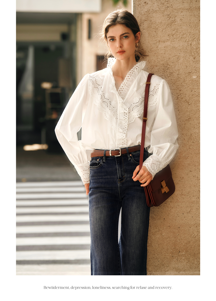 OLrain欧芮儿法式白色衬衫女冬季2024年新款荷叶领刺绣镂空衬衣