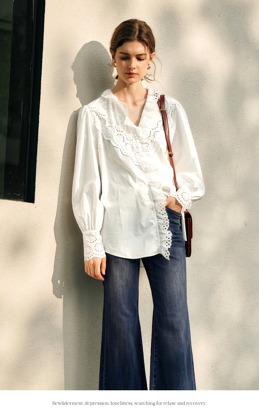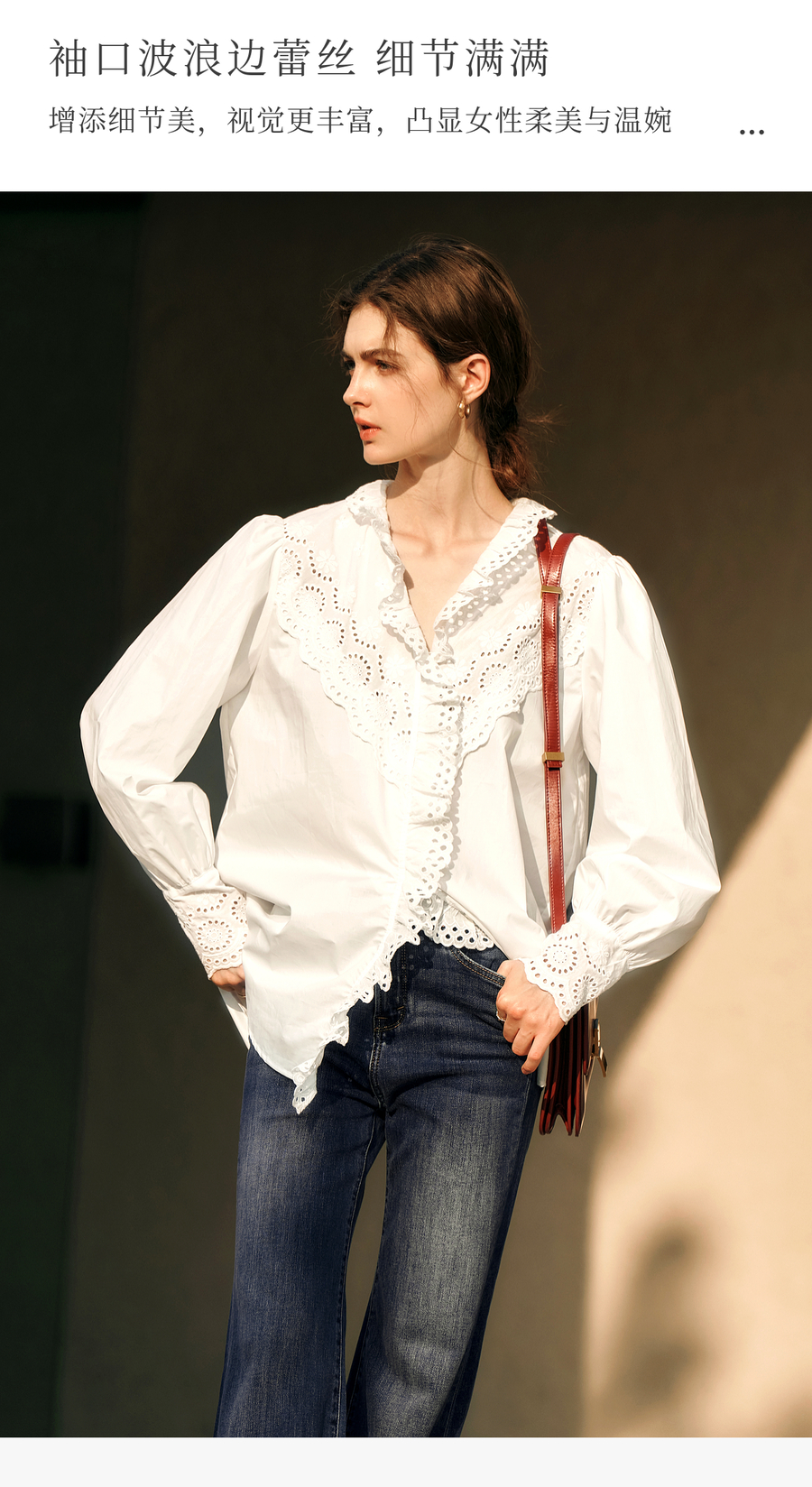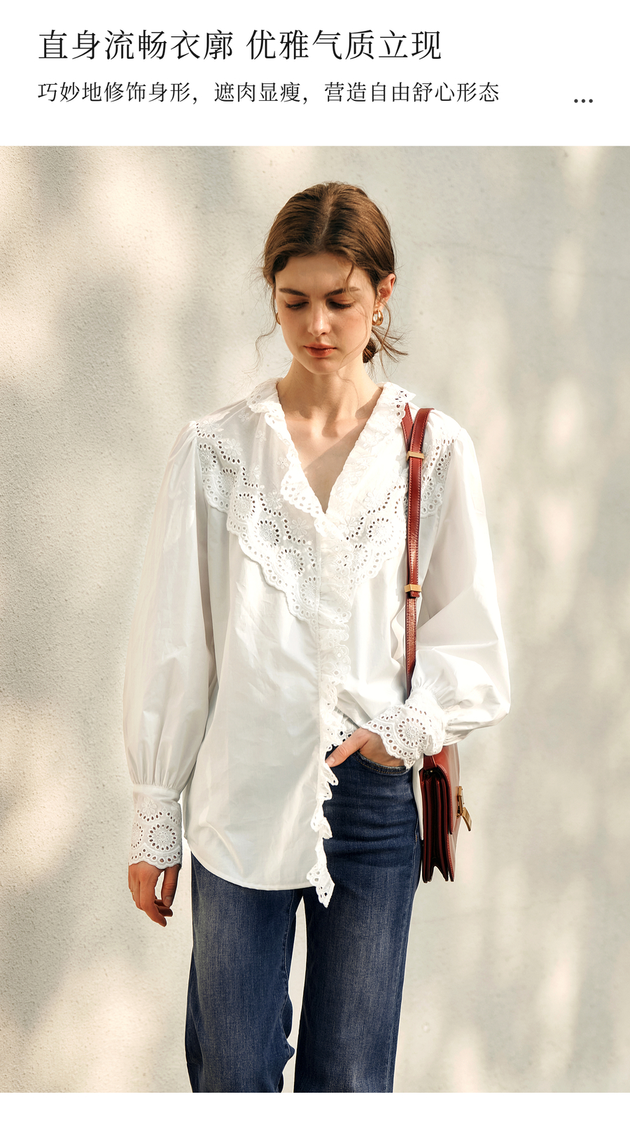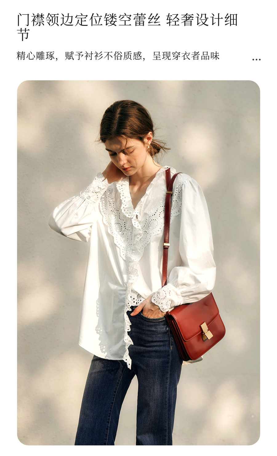 OLrain欧芮儿法式白色衬衫女冬季2024年新款荷叶领刺绣镂空衬衣