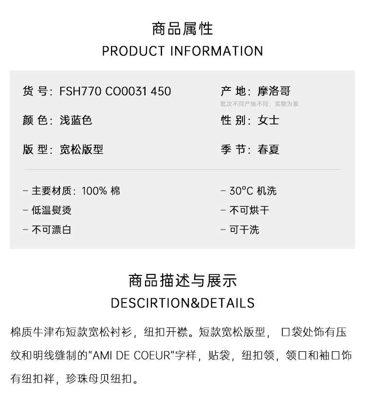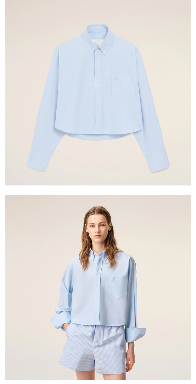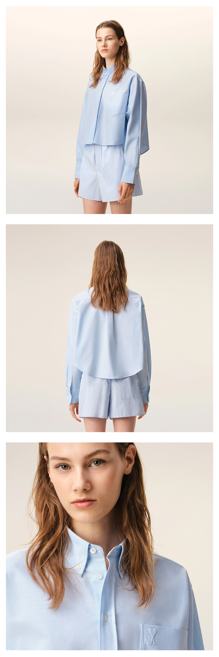AMI PARIS 女士心形徽标压花棉质短款宽松长袖衬衫 浅蓝色 FSH770 CO0031 450