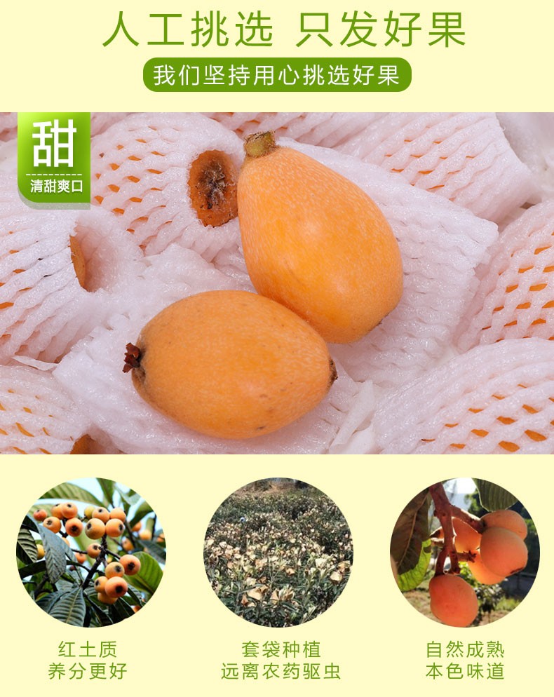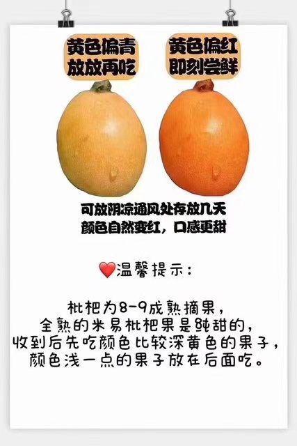 售后:签收24小时内、坏果同快递面单同框拍照。(备注:枇杷较弱,轻微磕碰不影响食用不售后。枇杷有一个天然退酸的过程,退酸的过程中的脱水现象可能会导致枇杷轻微皱皮,不影响食用,不在售后范围)