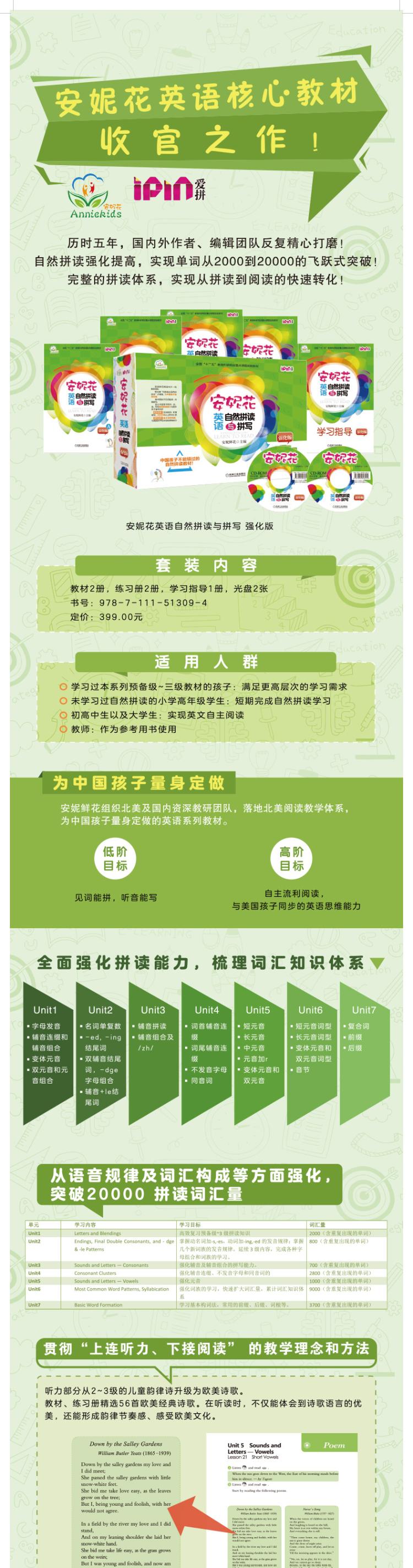 安妮花英语自然拼读教材是安妮鲜花组织北美及国内具有多年教学经验的教材研发团队,为中国孩子量身定制的完整英语启蒙体系。