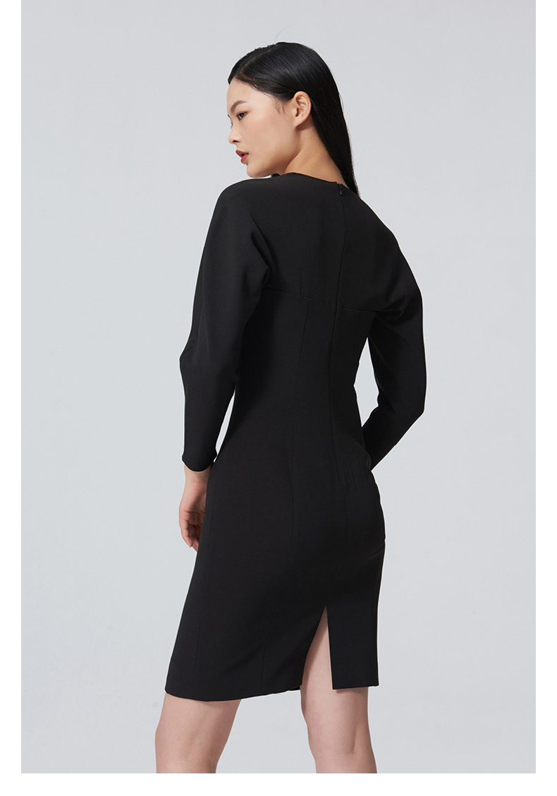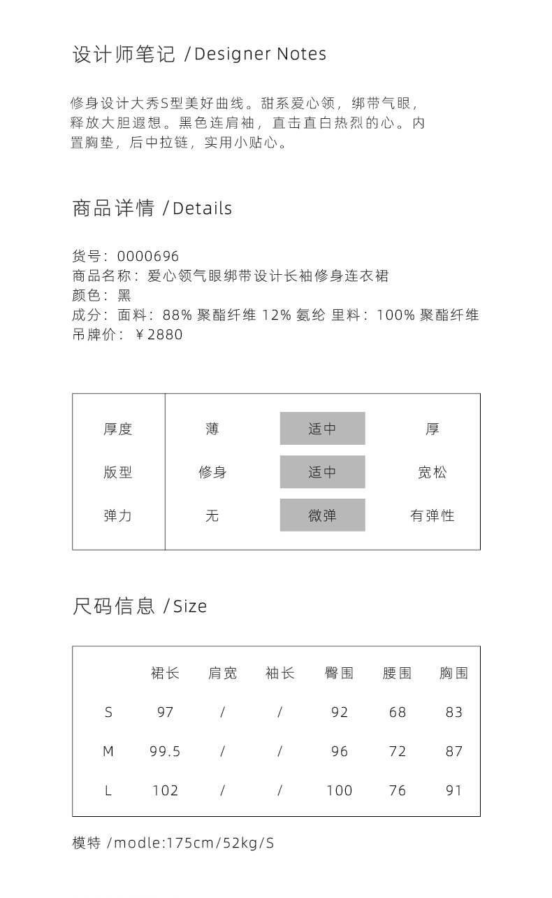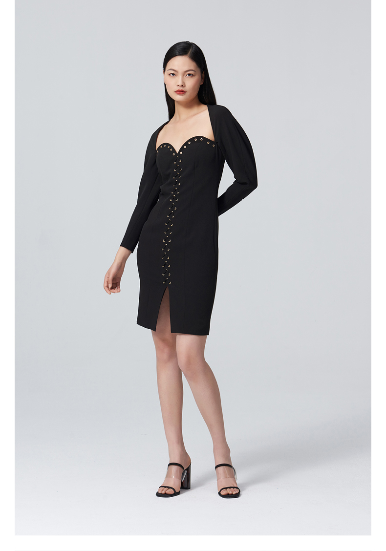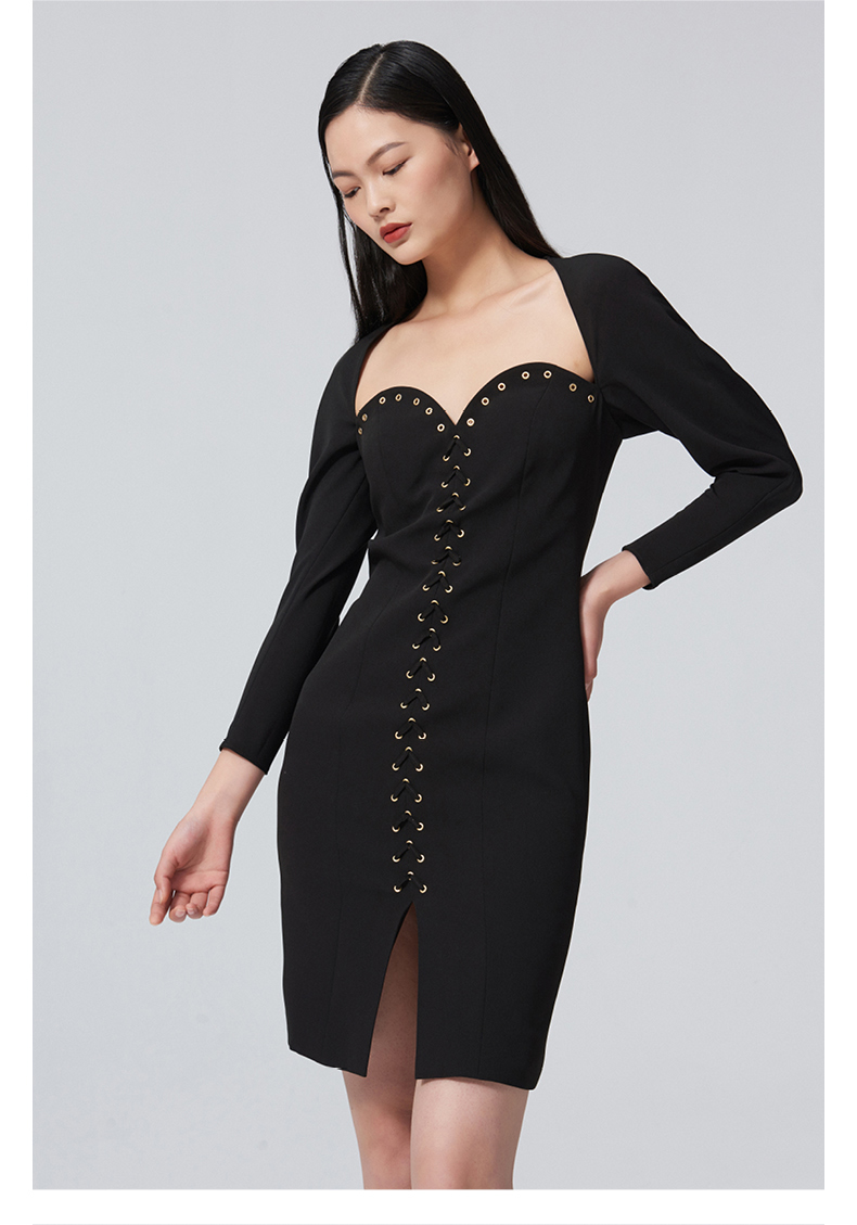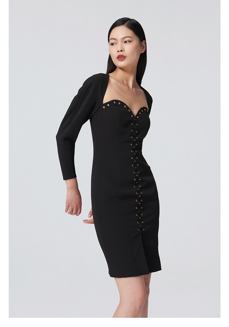 【猫眼】爱心领气眼绑带设计长袖黑色修身连衣裙/0000696