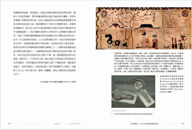 先秦時期就有四輪車、佛陀也是摩尼教先知、中國式鳳凰形象早在波斯經書出現,還有媽祖信仰早已傳播至美洲古巴和非洲剛果……等等,這一系列耳目一新的東西方交流例證,都在書中一一呈現,實實在在闡述了富含永恆魅力的絲路精神。全書56 篇文章,為過去五年發表於《今日中國》期刊特約專欄,通過多年世界各地實地考察,精心彙集大量古代器物及圖像,相互比較分析,生動地展現古代絲路沿線文明互鑒的宏大圖景。屈原在《離騷》提到「路漫漫其修遠兮,吾將上下而求索。」是故本書以「路漫修遠」為軸,梳理古代觀念的脈絡,化作曉暢文字,期許讀者求索前人經驗之餘,能懷揣多元共生的氣度,繼續砥礪前行。