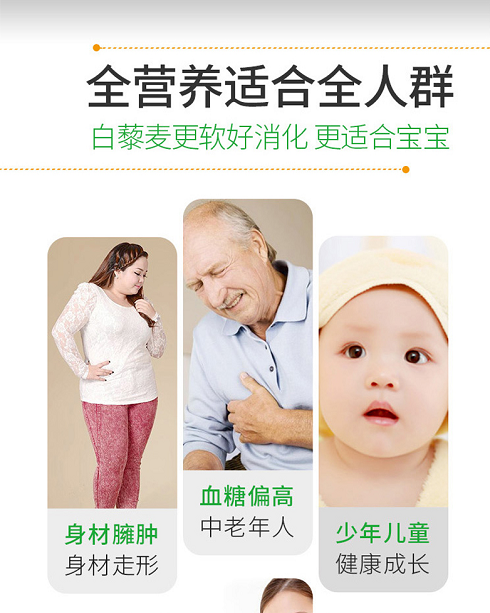 适于所有群体食用,尤其适于高血糖、高血压、高血脂、心脏病等慢性病,以及婴幼儿、孕产妇、儿童、学生、老年人等特殊体质和生活不规律人群。长期食用,效果显著。