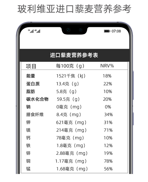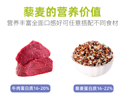 藜麦是全谷全营养完全蛋白碱性食物,胚乳占种子的68%,且具有营养活性,蛋白质含量高达16%-22%(牛肉20%),品质与奶粉及肉类相当,富含多种氨基酸。