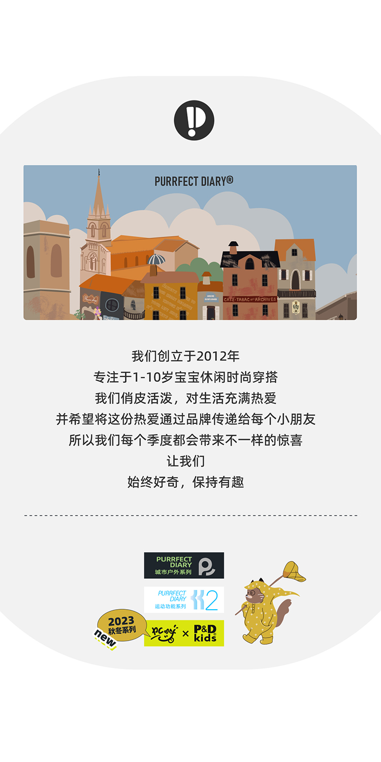 - Purrfect-Diary专注于贴近自然随性的穿着概念,轻奢平价的童装文化传播,在产品设计上更加注重婴童穿着的舒适性、安全性、更出众的国际化品牌,将欧美的育婴文化在中国进行深入的传播与推广。