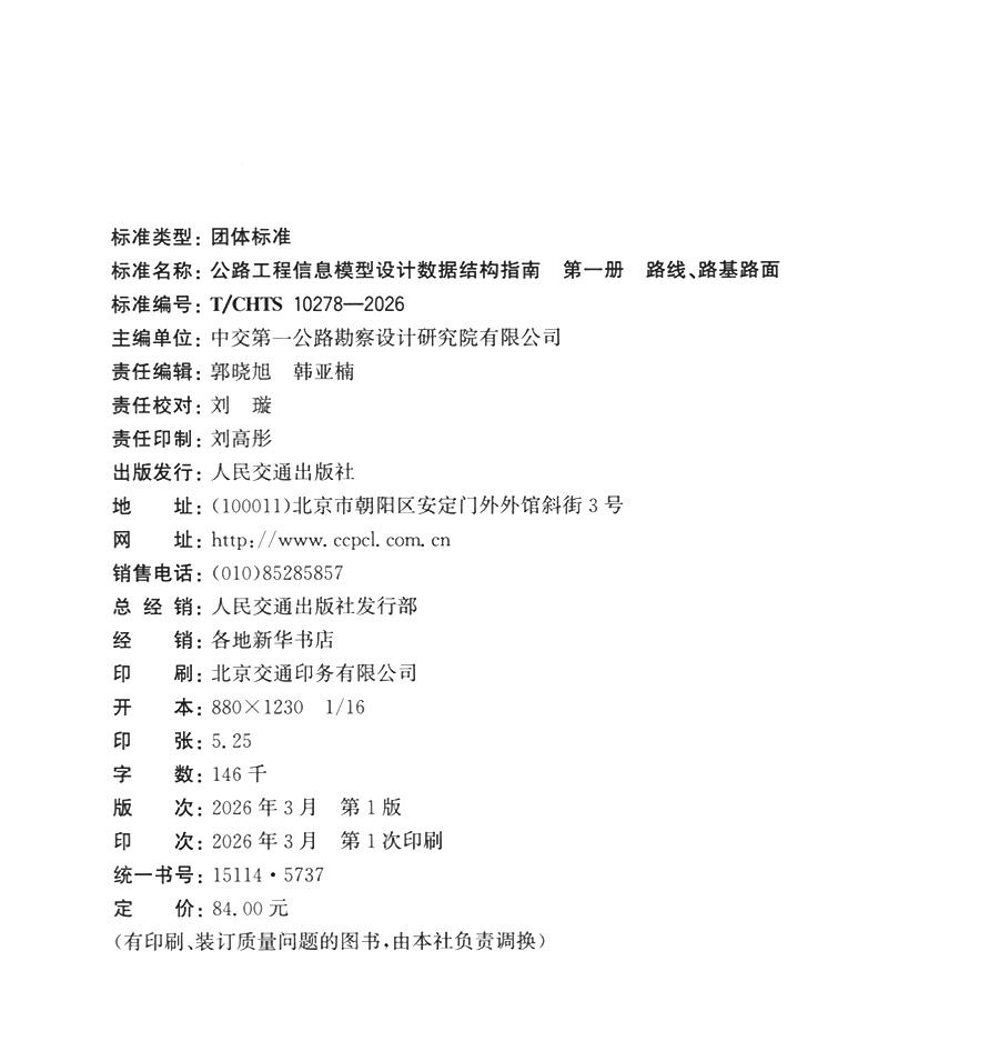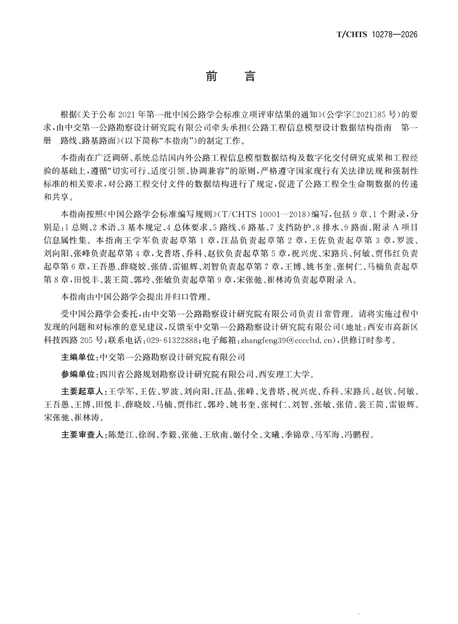 书名:公路工程信息模型设计数据结构指南 第一册 路线、路基路面(T/CHTS 10278—2026)