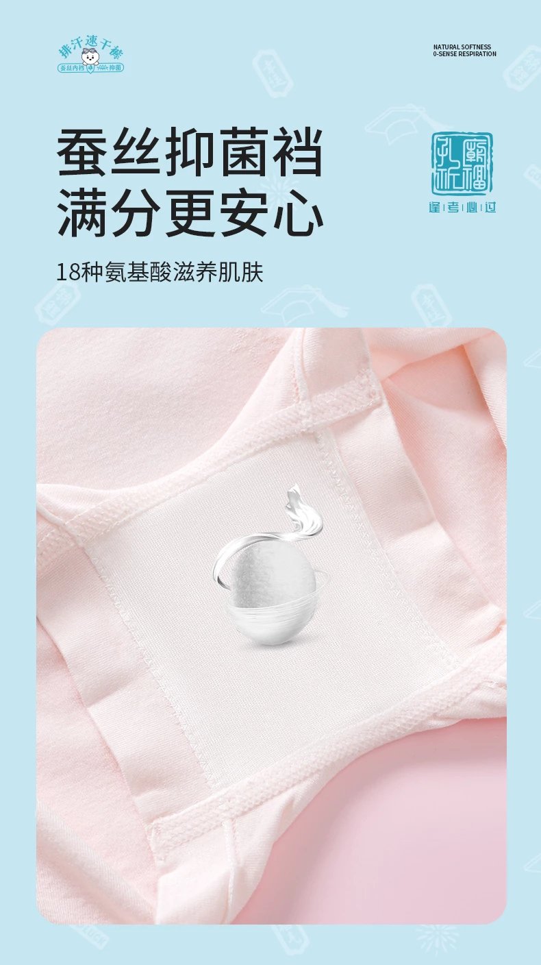 AAA级天然蚕丝抑菌裆布 可以起到极好的保护作用, 在孩子穿着时可以减少病菌的传播, 给宝宝有一个健康的环境。