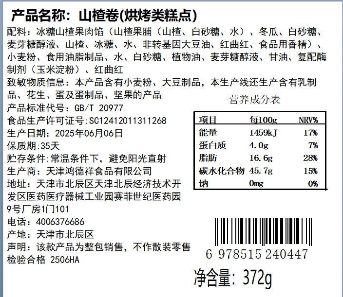 【老字号】祥禾饽饽铺 山楂卷 372g
