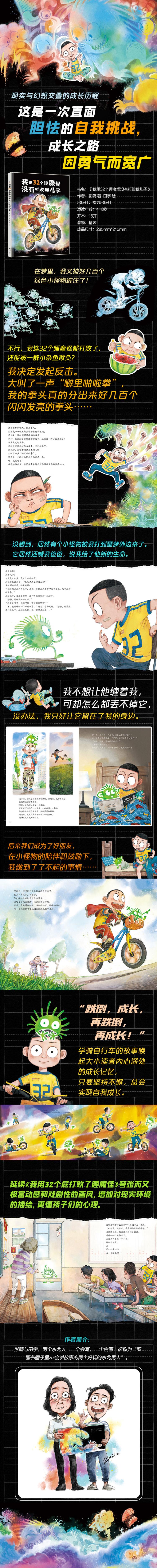★ 畅销幽默图画书《我用32个屁打败了睡魔怪》续集,幽默爆笑,想象飞扬,增添更多真实生活氛围★ 一个学骑自行车的励志故事,一个与小怪物“儿子”斗智斗勇的好玩故事,一个克服“失败”恐惧拥抱进步的成长故事。★ 骑着滑板车来到广阔白天下的“赶不走”小怪物,成为了男孩的朋友,听听男孩与小怪物打打闹闹的友情故事,让孩子懂得珍惜友谊,树立同伴交往的正确态度。★ 一幅幅夸张又极富戏剧感的画面,一个个精彩激烈、脑洞大开的斗智斗勇场景,全都由曾任中央美术学院绘本工作室导师的有名图画书作家田宇精心绘制,每一张页面里都藏着满满的笑点,真正能让孩子从头笑到尾,笑声不间断。