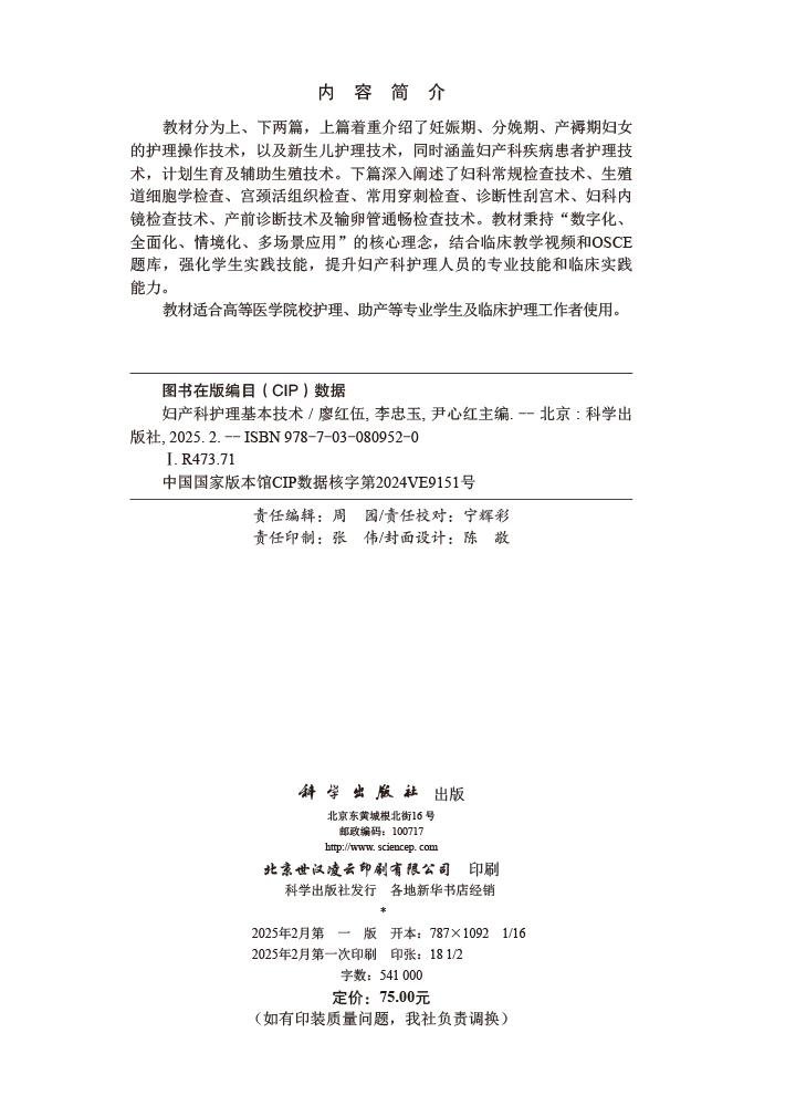 妇产科护理基本技术 廖红伍 李忠玉 尹心红编 适合高等医学院校护理 助产等专业学生及临床护理工作者使用9787030809520科学出版社