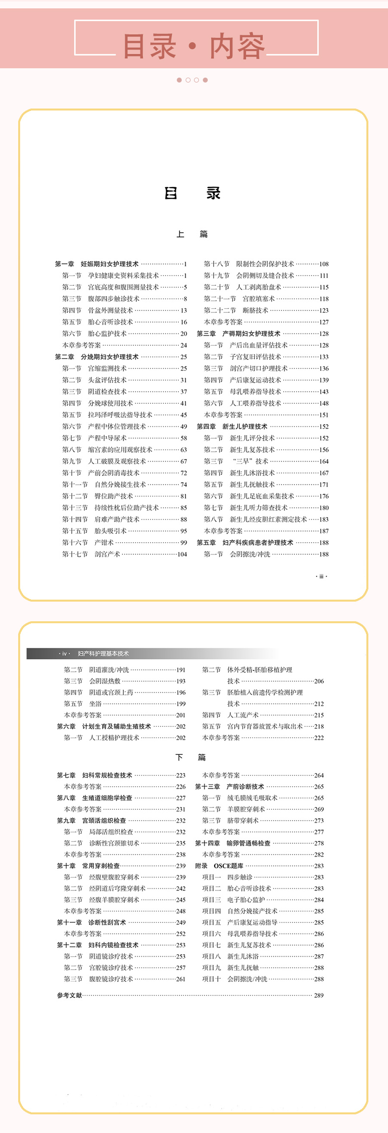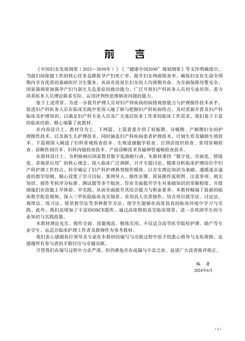 教材分为上、下两篇,上篇着重介绍了妊娠期、分娩期、产褥期妇女的护理操作技术,以及新生儿护理技术,同时涵盖妇产科疾病患者护理技术,计划生育及辅助生殖技术。下篇深入阐述了妇科常规检查技术、生殖道细胞学检査、宫颈活组织检査、常用穿剌检査、诊断性刮宫术、妇科内镜检査技术、产前诊断技术及输卵管通畅检査技术。教材秉持“数字化、全面化、情境化、多场景应用”的核心理念,结合临床教学视频和OSCE题库,强化学生实践技能,提升妇产科护理人员的专业技能和临床实践能力。