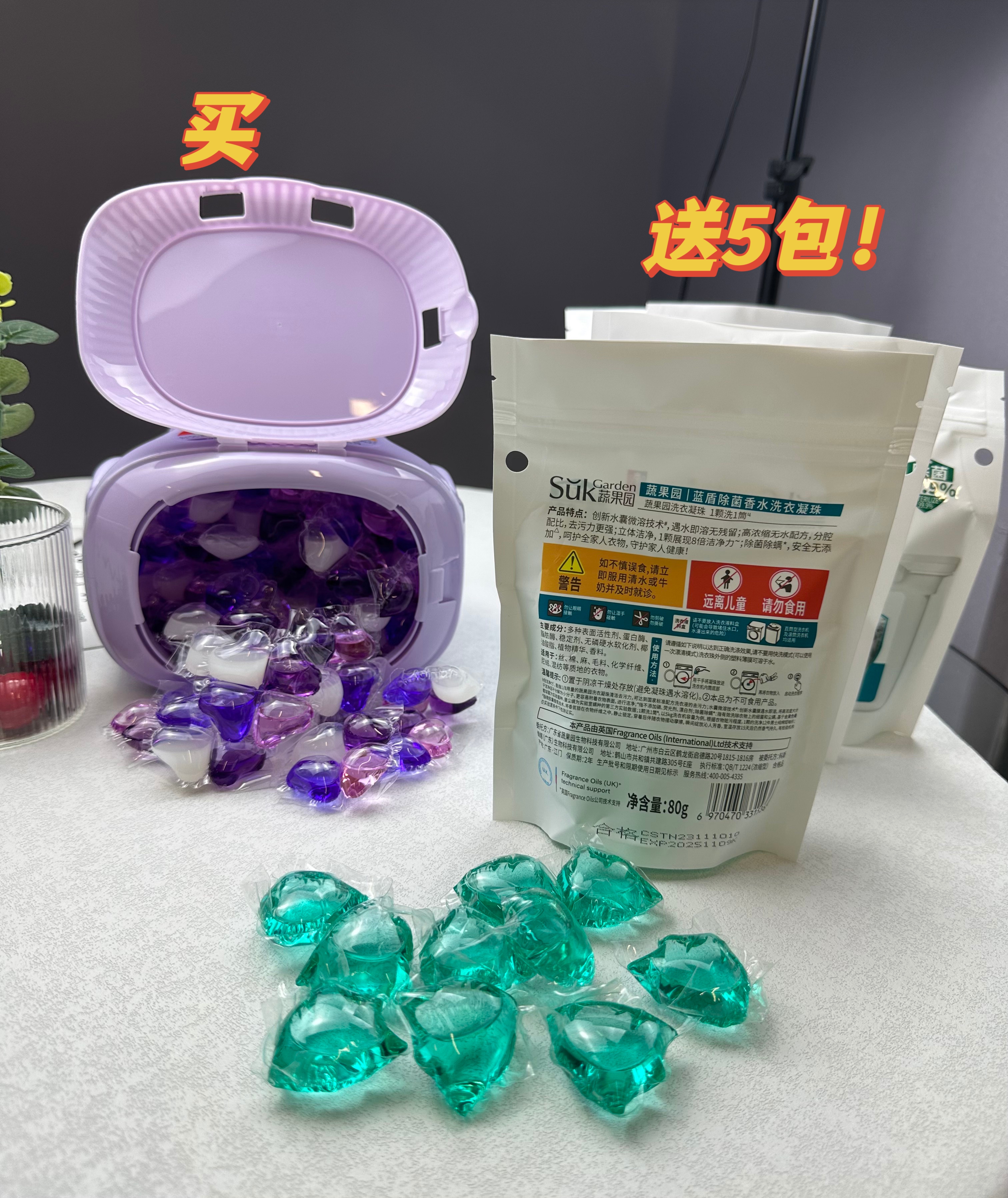 2、蔬果园贝蒂蓝薰衣草香氛4D洗衣凝珠(浓缩强效型):10g*52颗*1盒+蔬果园蓝盾除菌香水洗衣凝珠:8g*10颗(袋装)*5袋