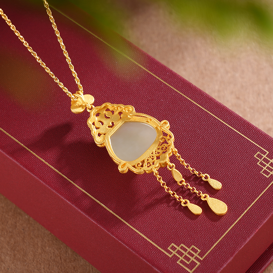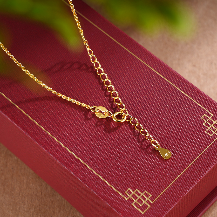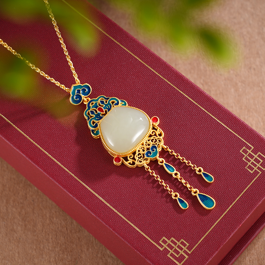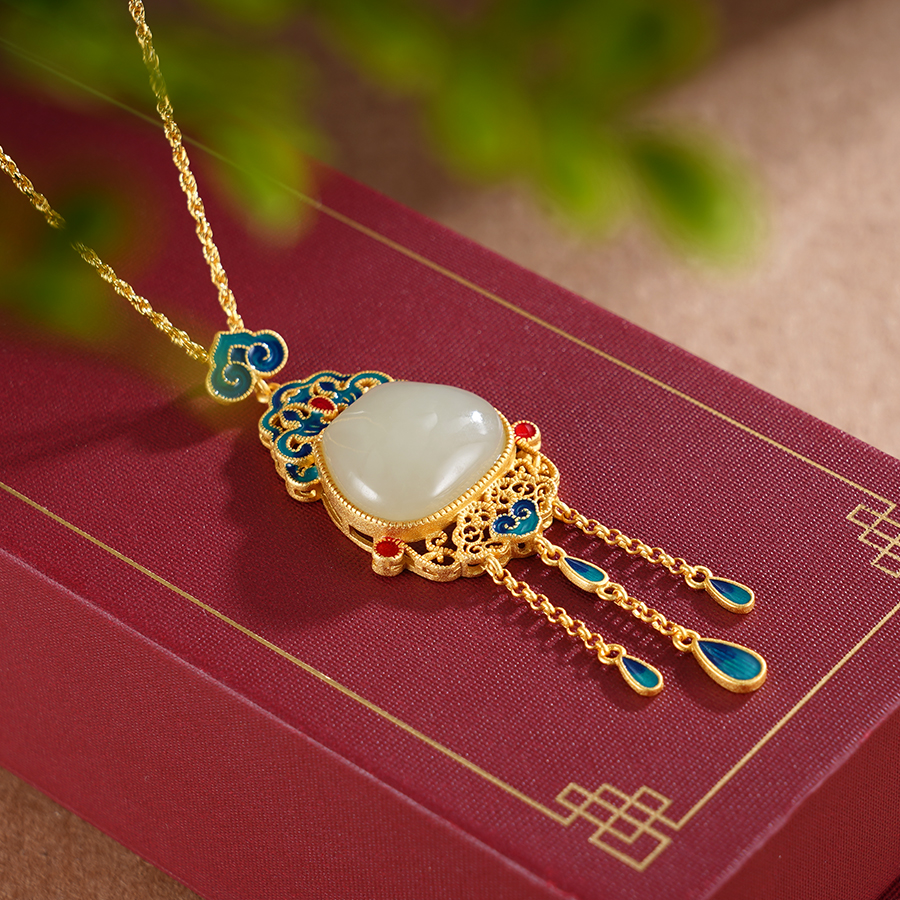 【寓意】:一款典雅宫廷风吊坠,以珐琅彩绘制祥云图案,与镀金链条相互映衬。佩戴于身,整体造型更添一抹夺目光辉。