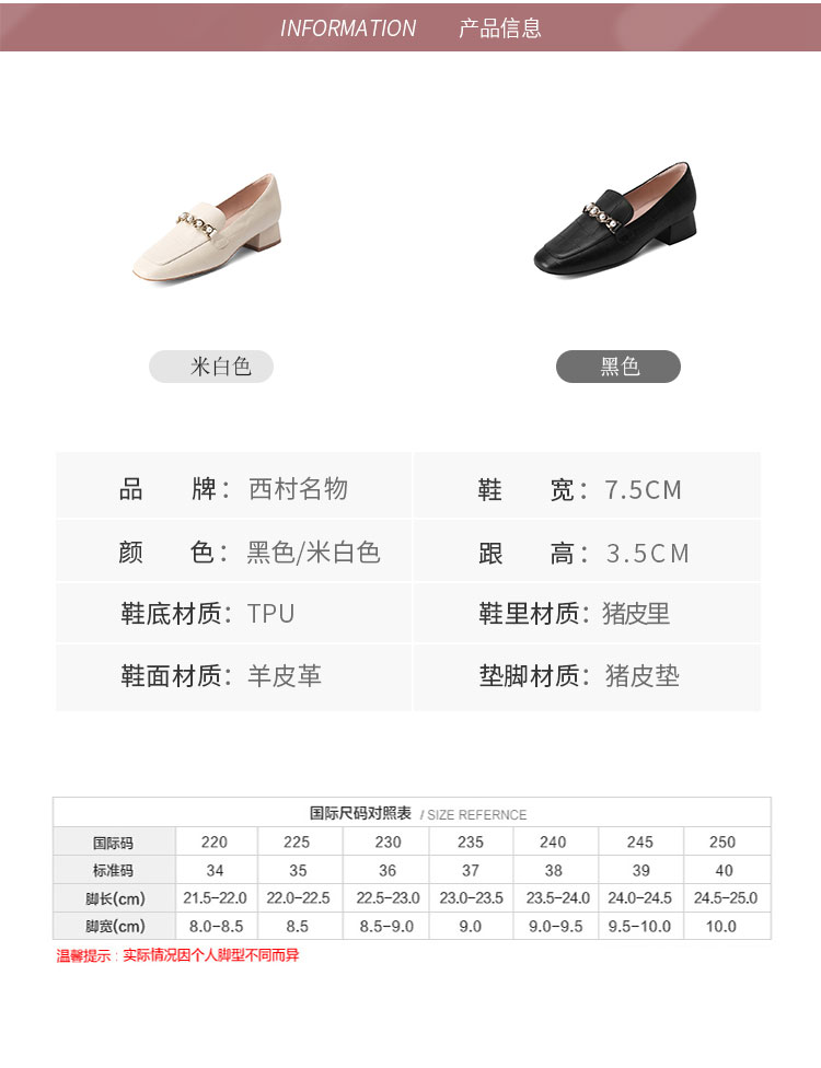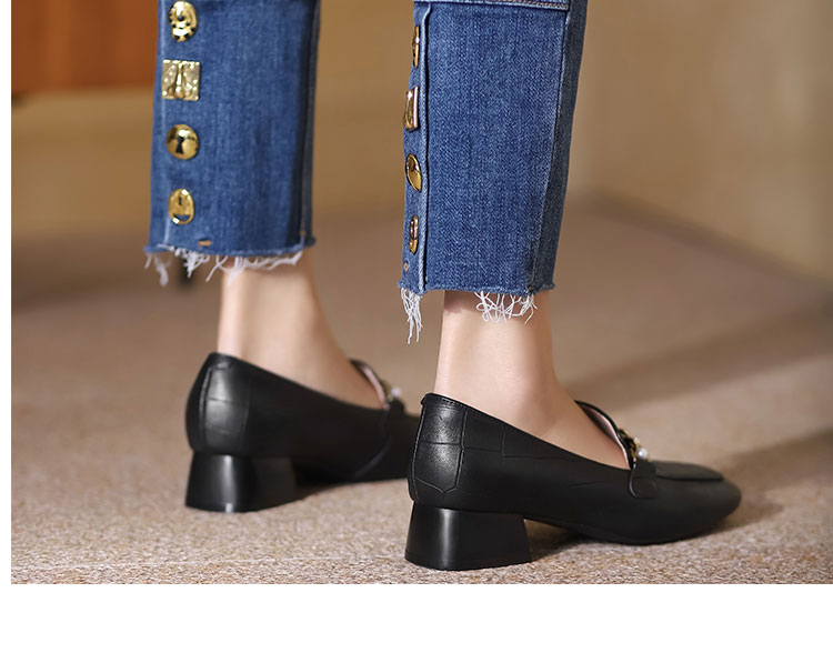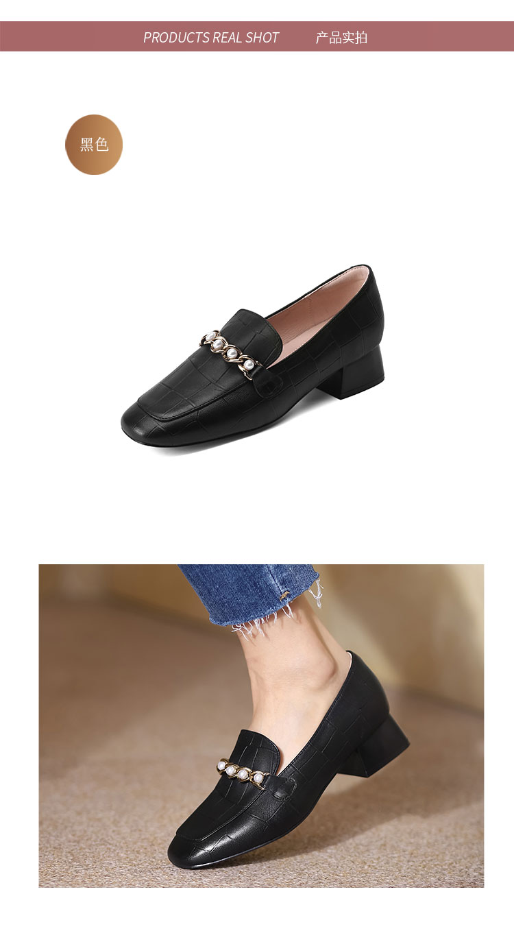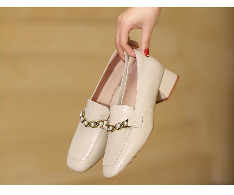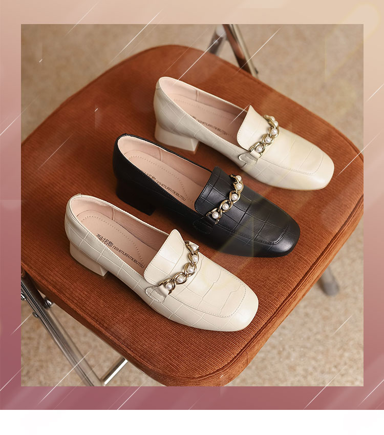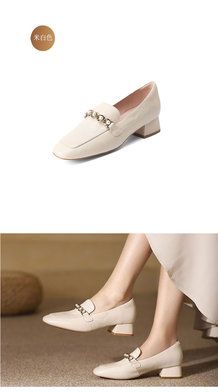 西村名物22秋季新款中粗跟方头单鞋女复古珍珠白搭乐福鞋17731