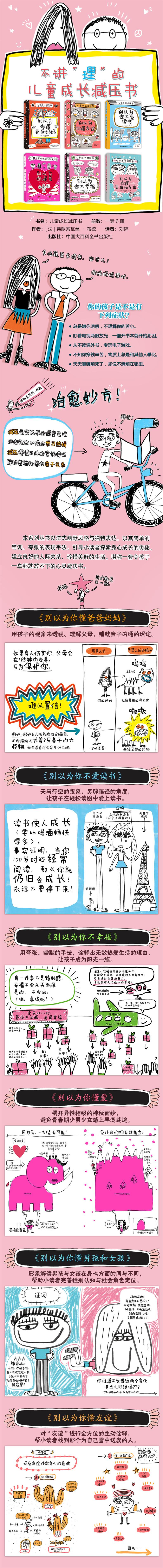 《儿童成长减压书》系列是一套法国引进版绘本,包括《别以为你懂爸爸妈妈》《别以为你不爱读书》《别以为你不幸福》《别以为你懂男孩女孩》《别以为你懂友谊》《别以为你懂爱》6个分册。全书以儿童的视角为切入点,以法式幽默风格与独特的语言表达,形象解读了与孩子们息息相关的家庭关系、读书学习、日常生活、性别认知、人际交往等几大方面,通过大胆的想象和描述,引导儿童探索身心成长的奥秘、建立良好的人际关系、培养好的阅读习惯、珍惜幸福美好的生活。