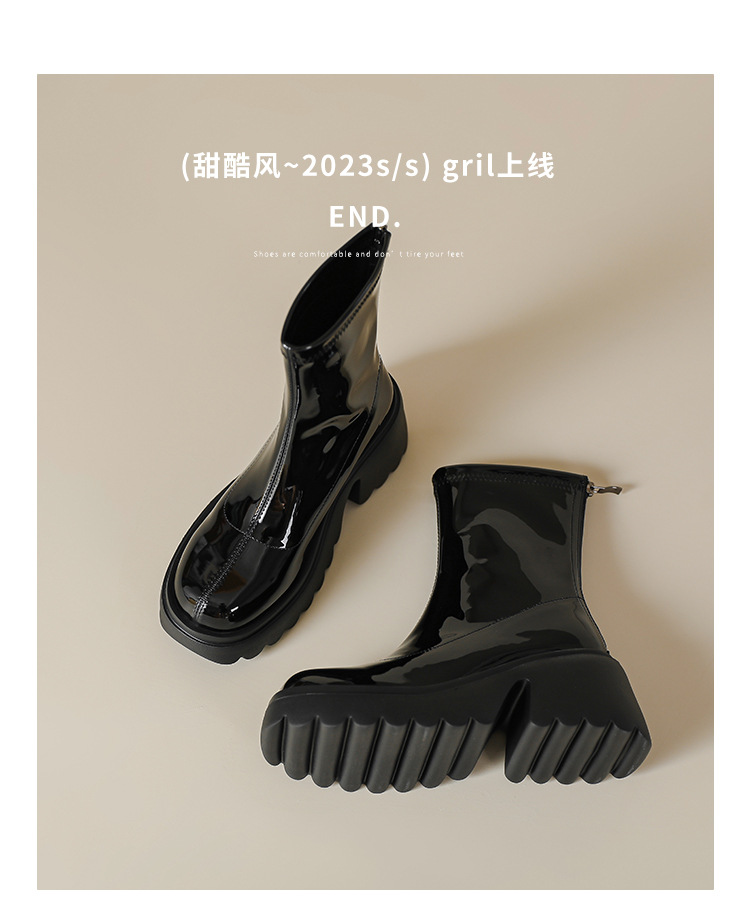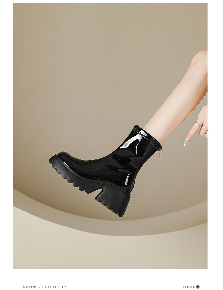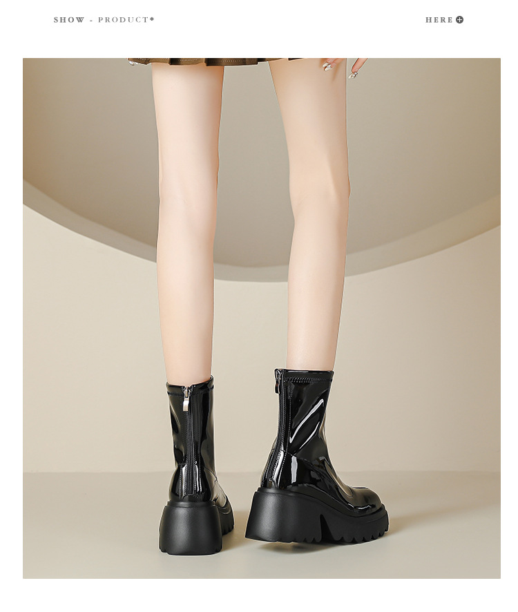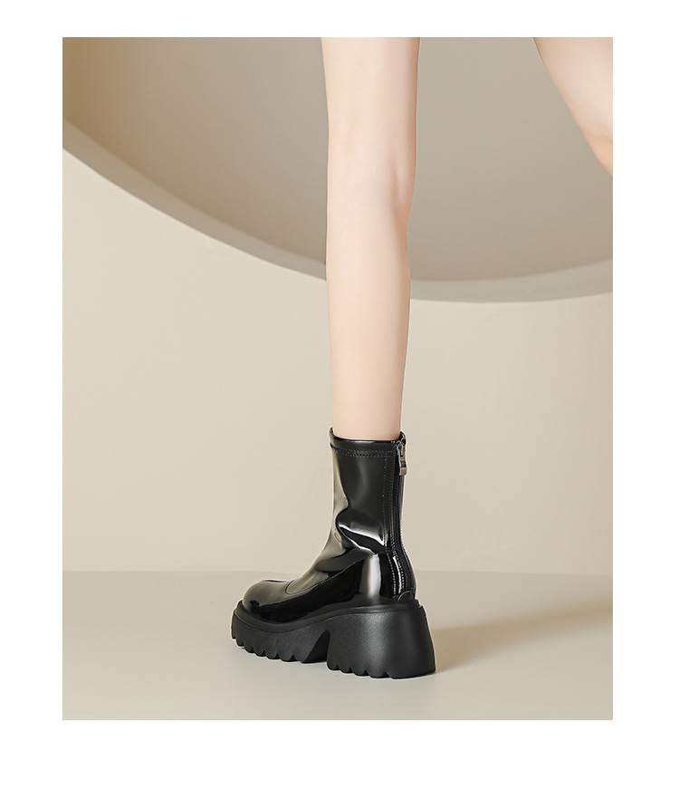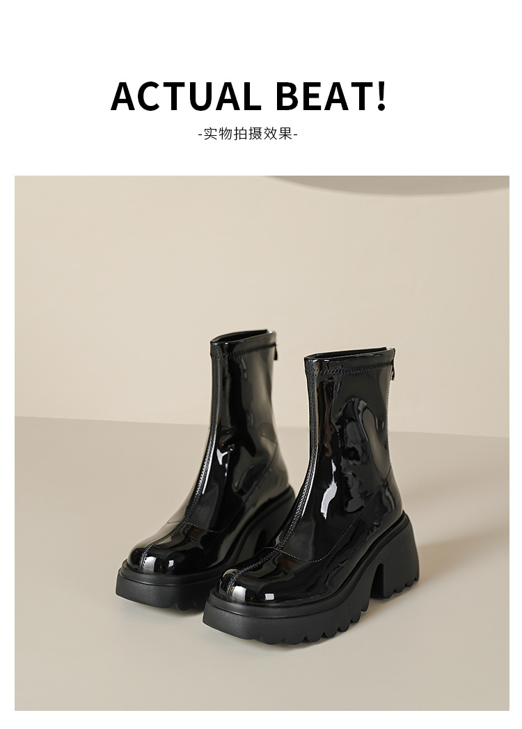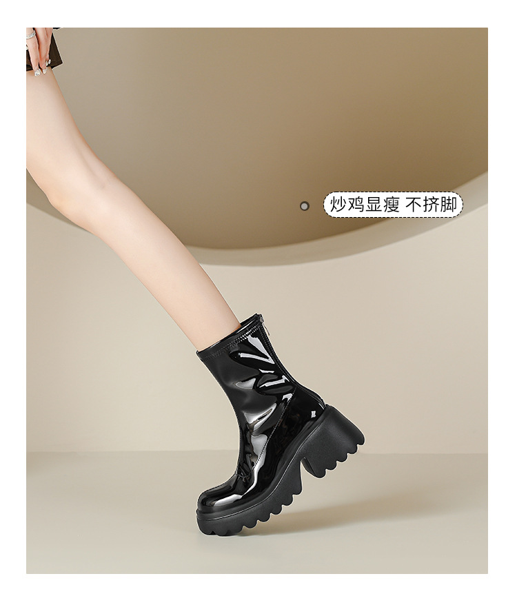 小个子女生增高厚底短靴女秋冬短筒7cm高跟漆皮粗跟瘦瘦靴防水台