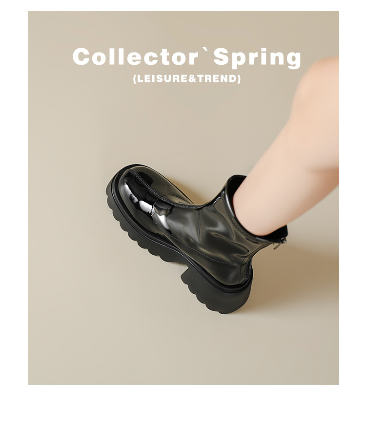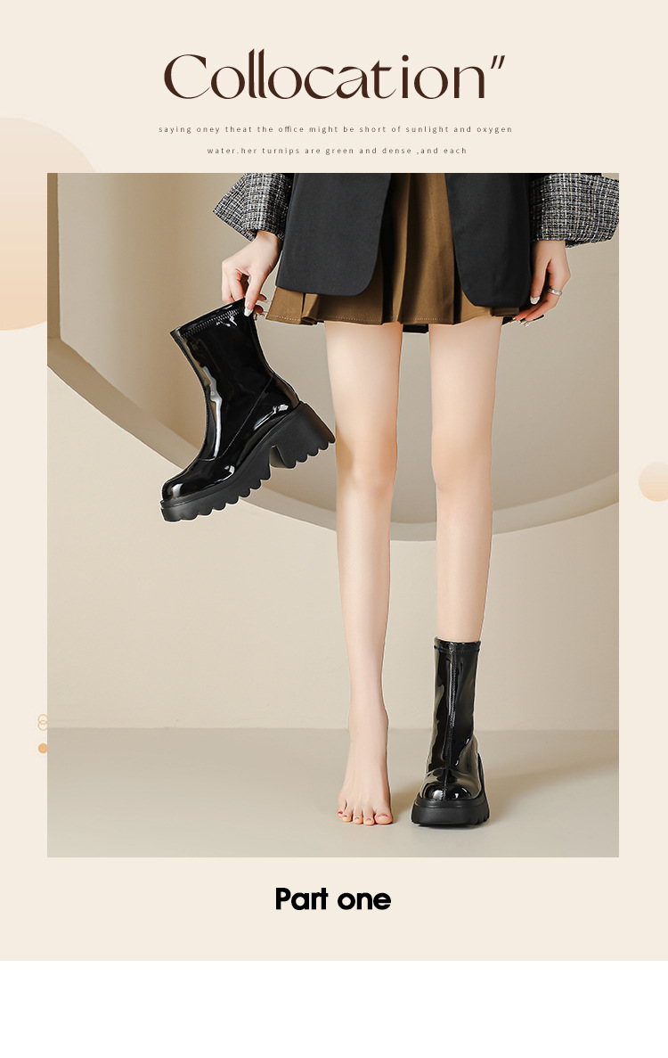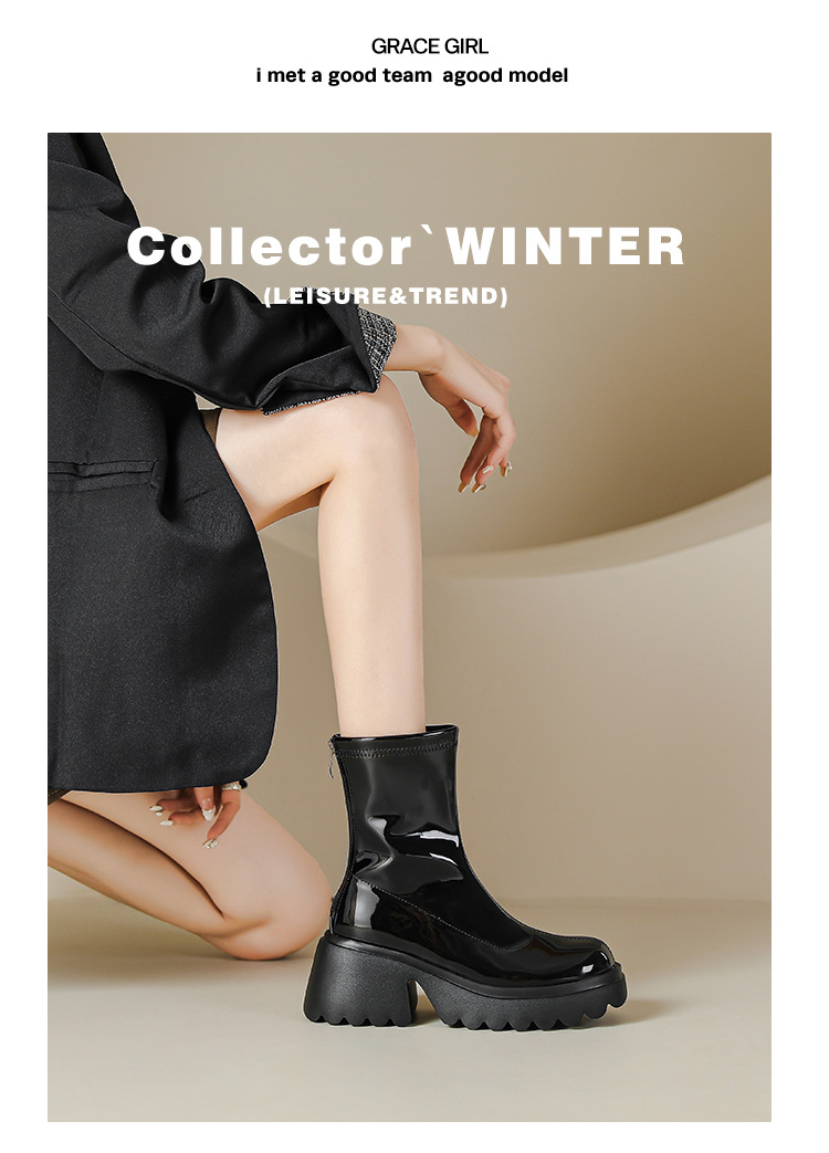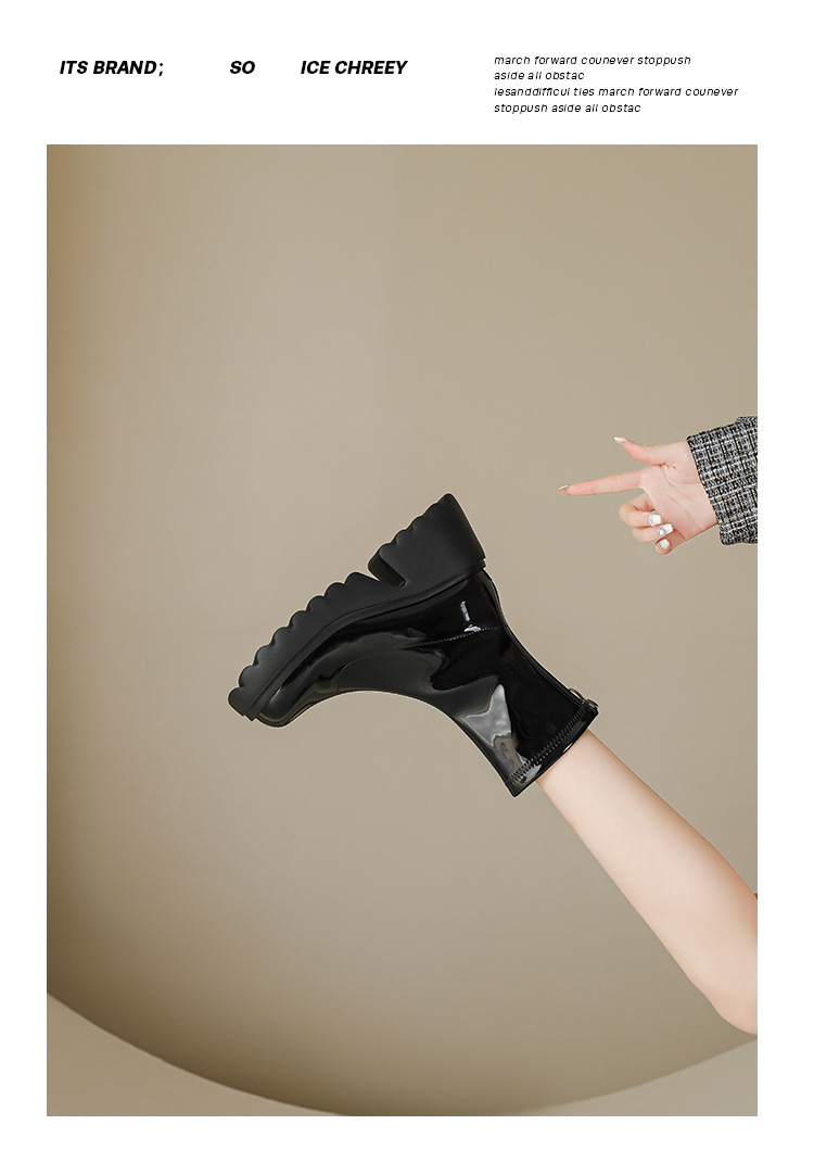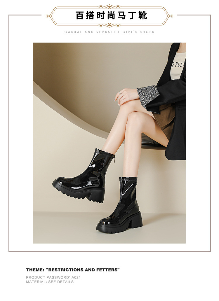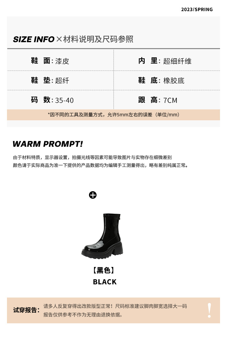 小个子女生增高厚底短靴女秋冬短筒7cm高跟漆皮粗跟瘦瘦靴防水台
