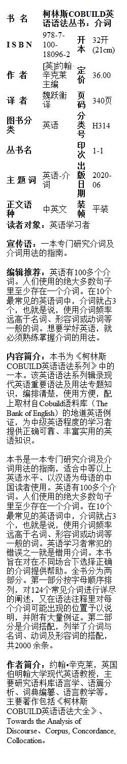 使用本书令读者更加熟识这一领域的英语。每一介词均有其特殊的意义范围,许多介词的使用相当有规则。它们的一般形式可见于本书第一部分。 共有124个介词、556 种不同的用法。