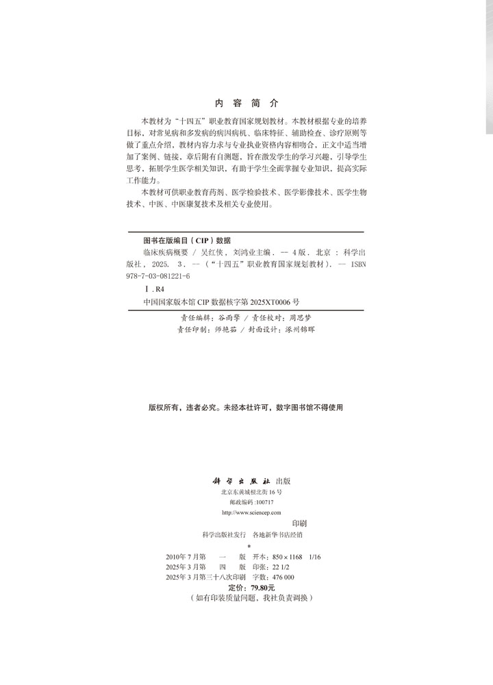 临床疾病概要 第4四版 昊红侠 刘鸿业主编 供职业教育药剂医学检验技术医学影像技术医学生物技术等 9787030812216科学出版社