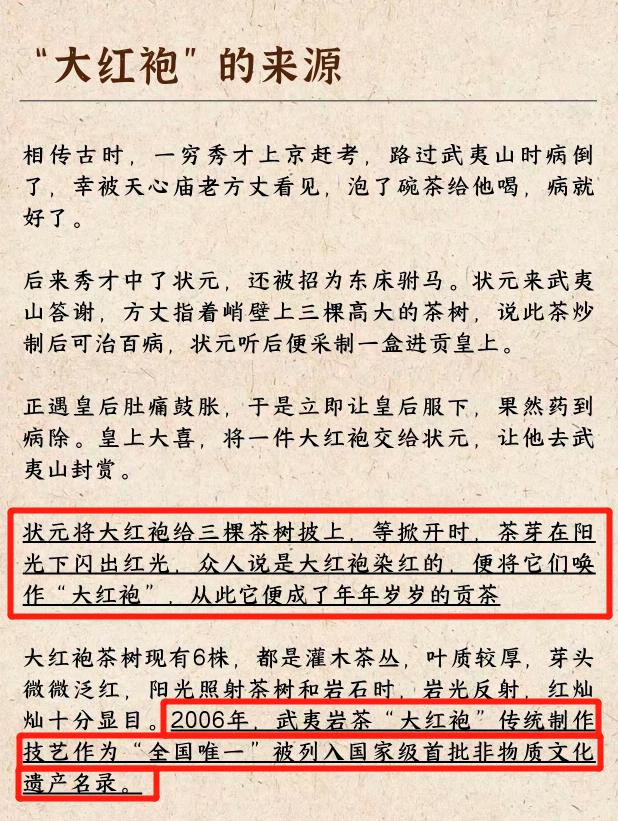 🔥 为什么这款大红袍值得你闭眼入? 🌿 武夷大红袍:从传奇历史里走来的 “茶中贵族” 你知道吗?武夷大红袍的故事,要从几百年前的武夷山说起。相传明代一举人赴考途经武夷山,突发腹痛,得和尚所赠大红袍茶,饮后病愈。他考中状元后,以锡罐带茶回京。恰逢皇后病重,百医无效,状元献茶,皇后饮后痊愈。皇上大喜,赐红袍一件,命状元赴九龙窠将红袍披于茶树上,并令其为贡茶,派官吏看管采制。因官吏每年着大红袍挂袍于茶树,此茶遂得名 “大红袍”。