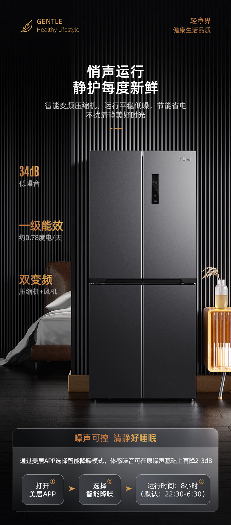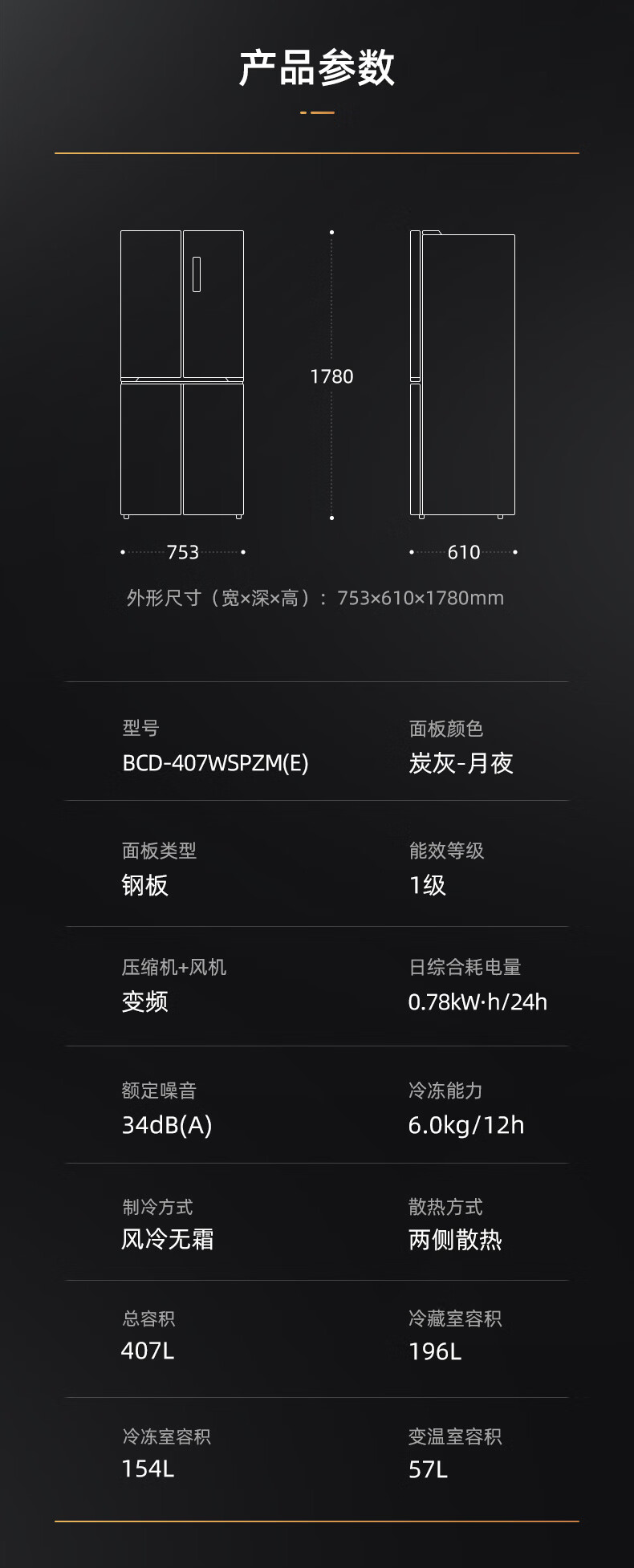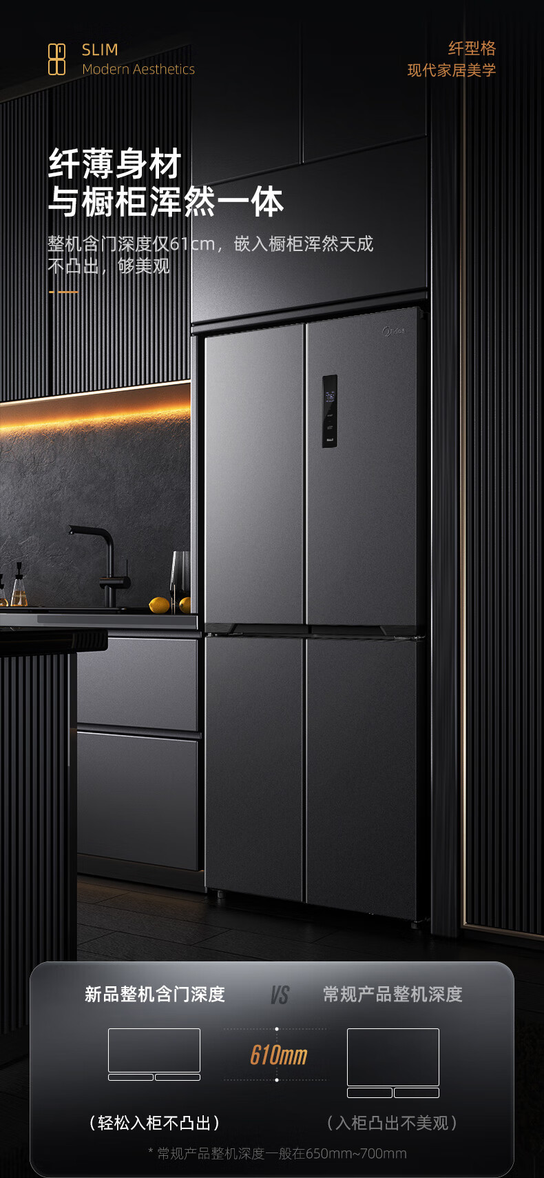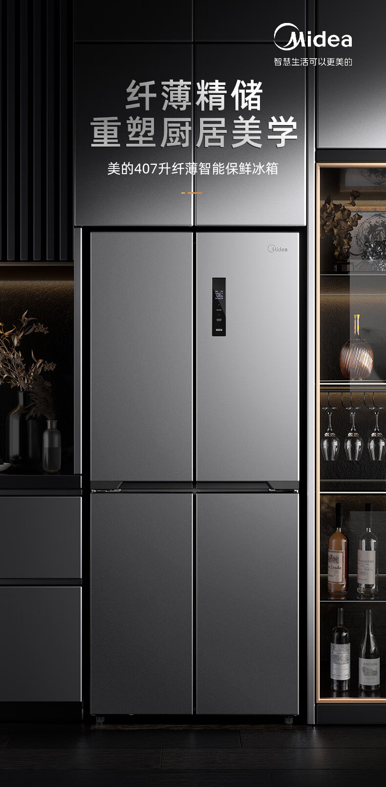 【下单前咨询地址库存】美的(Midea)61厘米薄407升一级智能双变频十字双开门对开四开门家用电冰箱大容量超薄可嵌入式 BCD-407WSPZM(E)月夜灰冰箱