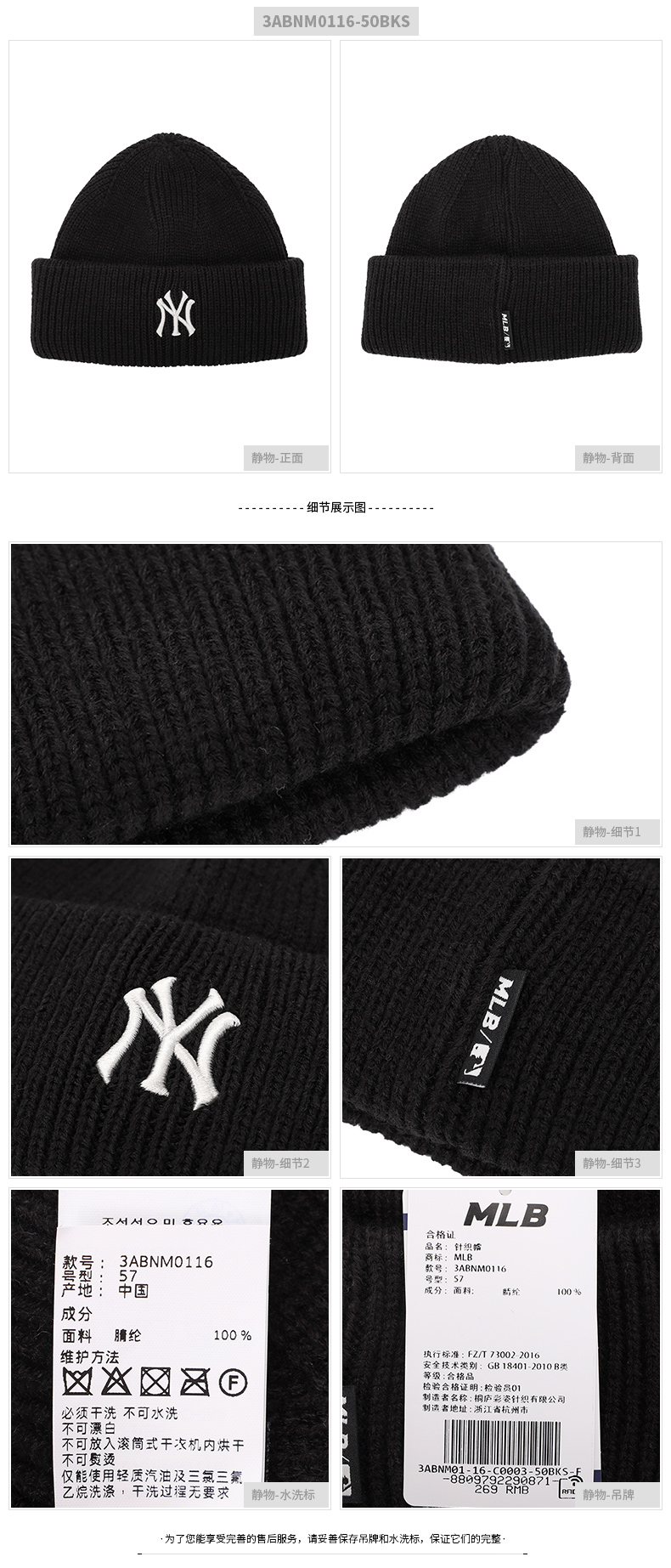 MLB官方 男女情侣毛线帽NY运动时尚黑色帽子潮21年秋冬新款 3ABNM0116-50BKS