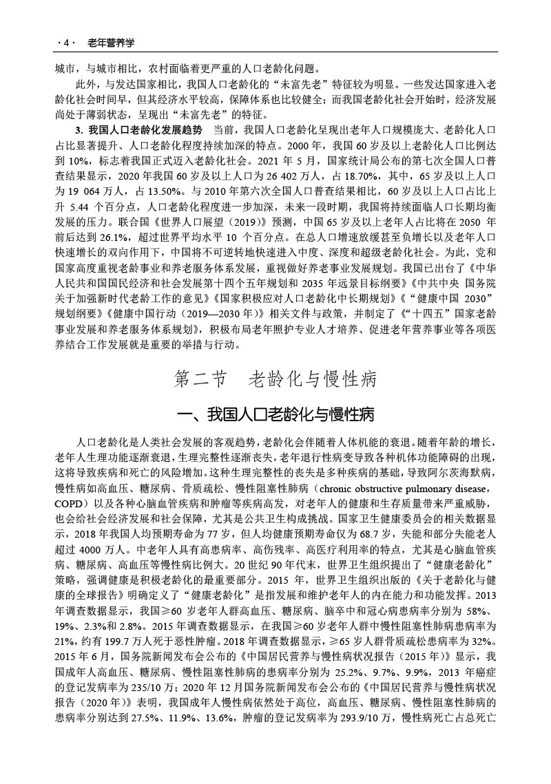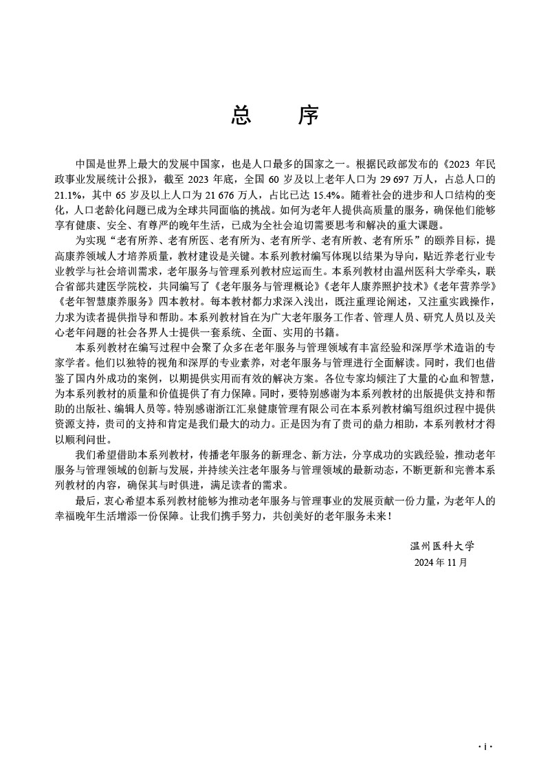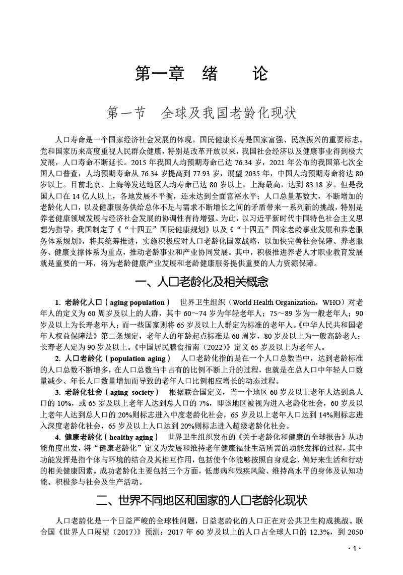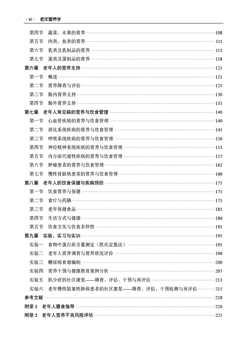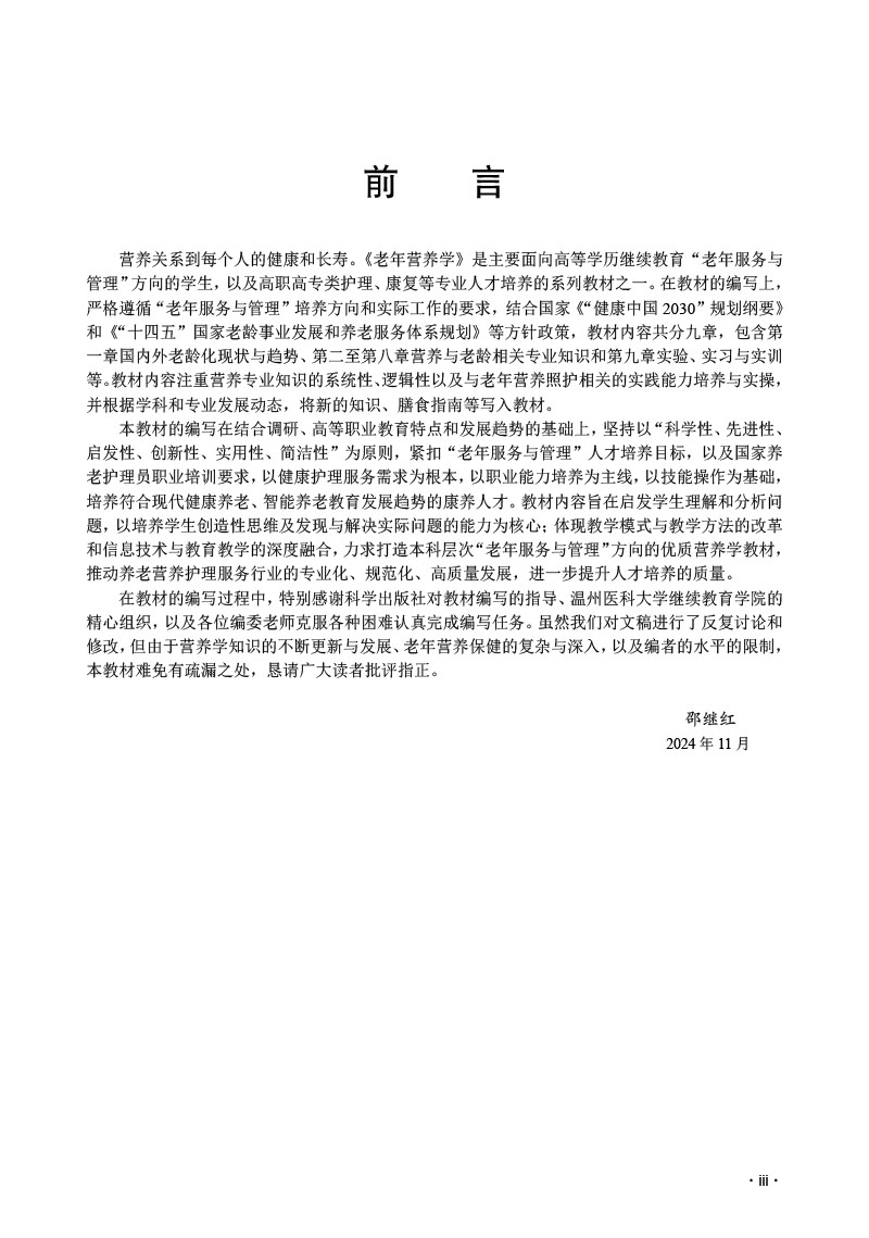 本教材共有九章,其中第一章介绍了目前国内外老龄化现状与趋势,以及营养与健康老龄化的关系,第二至第八章为营养学基础知识,营养与老龄照护相关内容,第九章为实验、实习与实训内容。每章后均有相关练习题,并配套电子PPT课件,书后配有相关附录资料。本教材编写坚持理论与技能操作实践相结合,信息技术能力与人文精神相结合,职业素质与医德素养相结合;借鉴国内外相关人才培养和教材建设经验,科学整合教学内容,打造精品教材,便于学习者掌握和应用。