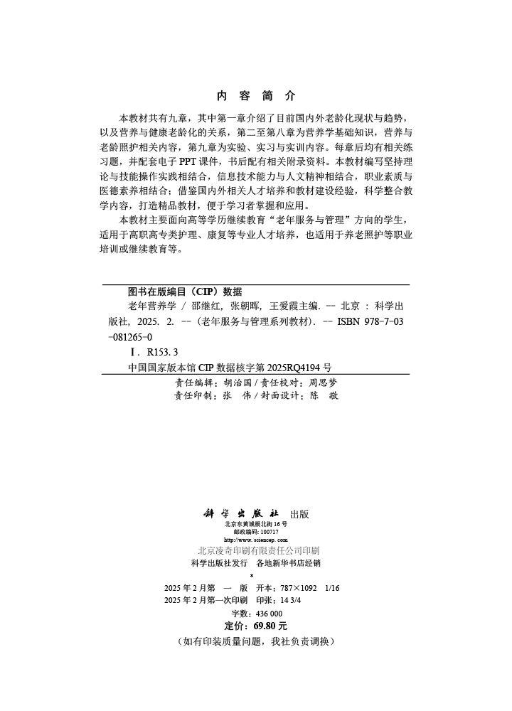 老年营养学 老年服务与管理系列教材 邵继红 张朝晖 王爱霞 适用于高职高专类护理 康复等专业人才培养等9787030812650科学出版社