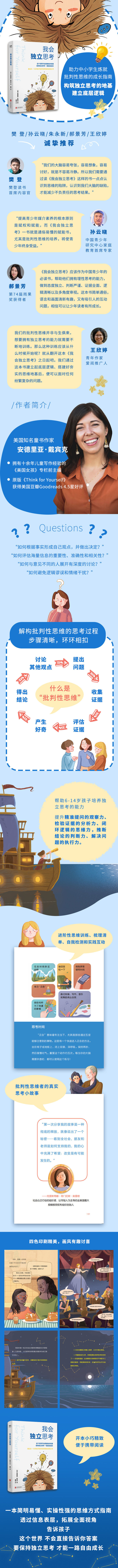 “这本书太棒了!安德里亚将批判性思维的思考过程拆解为自主提问、收集信息、评估证据、讨论异见、得出结论等环环相扣的清晰步骤,还穿插了章节小测验帮助你更加了解自己的深层想法。读完后,再看看你自己的思考中到底欠缺了什么吧!”