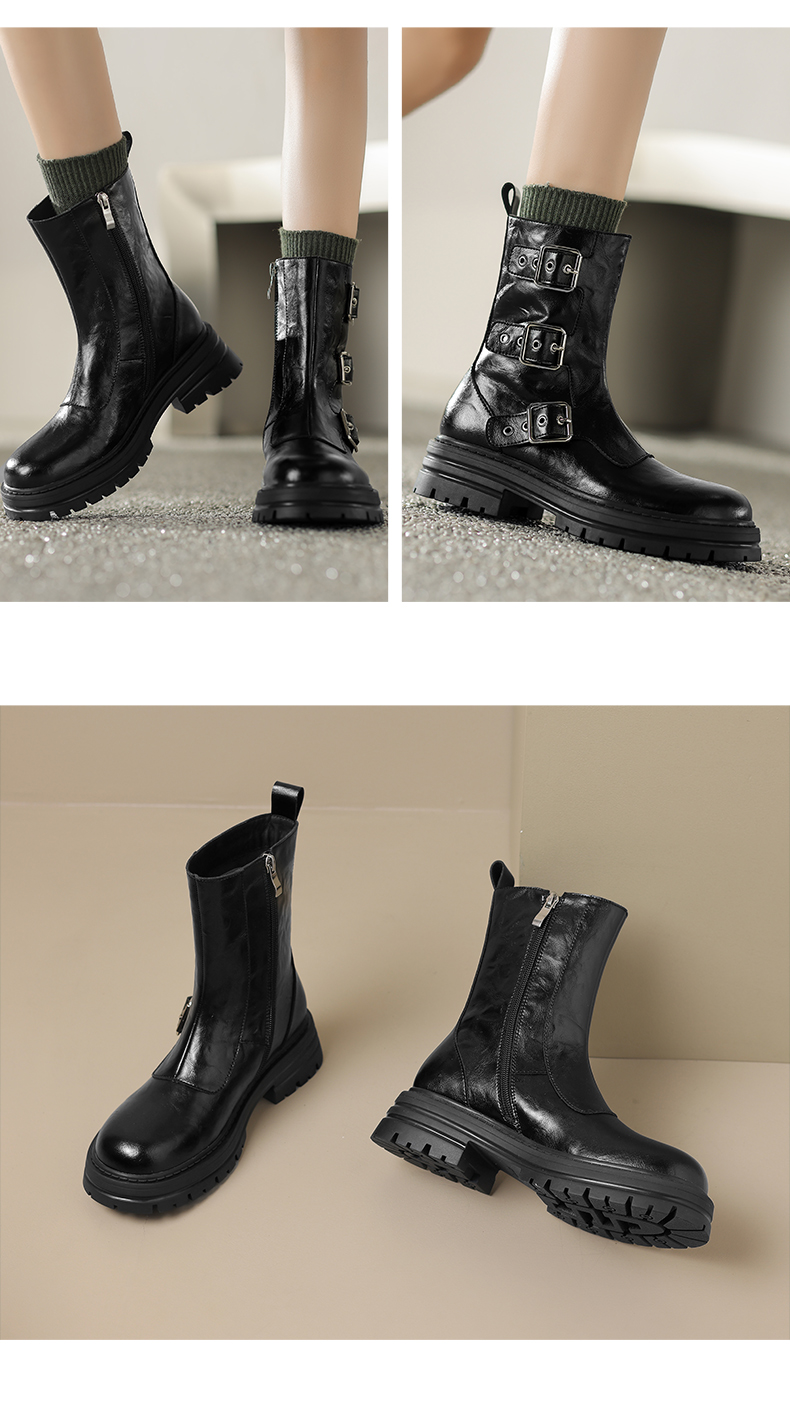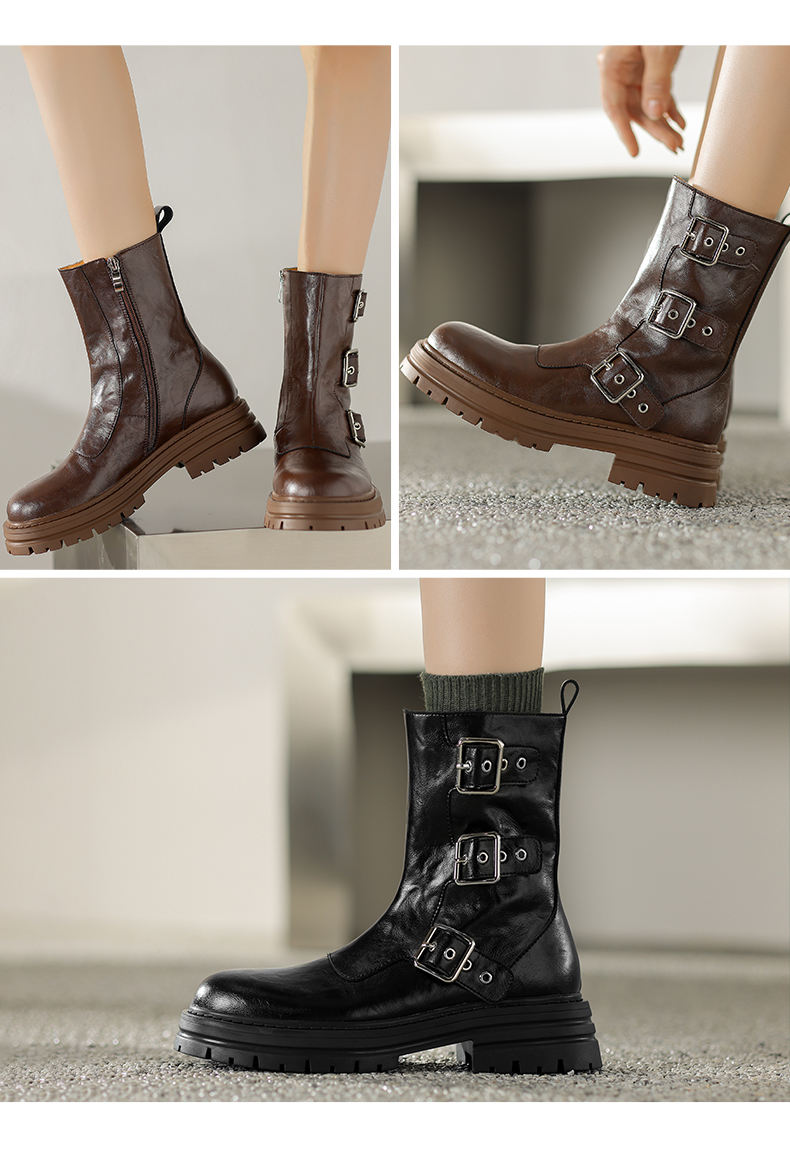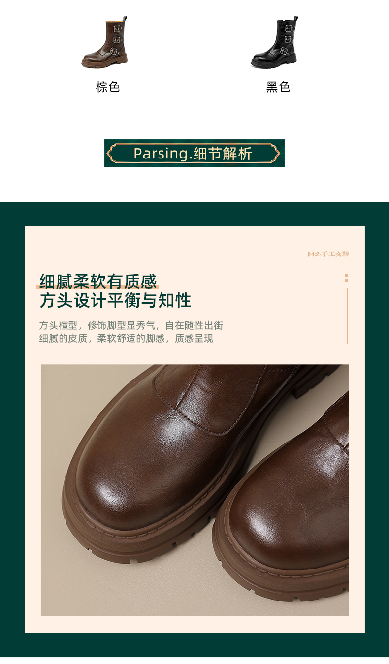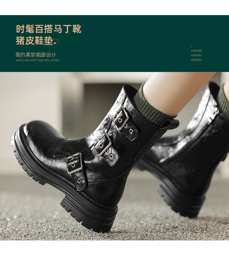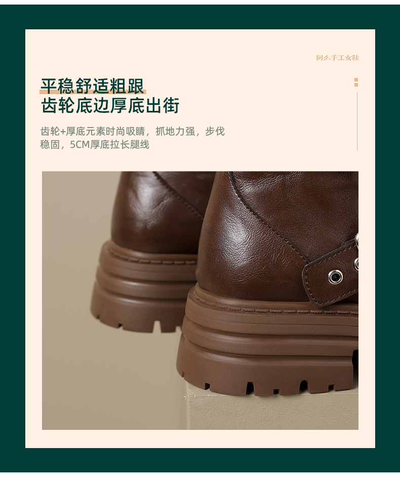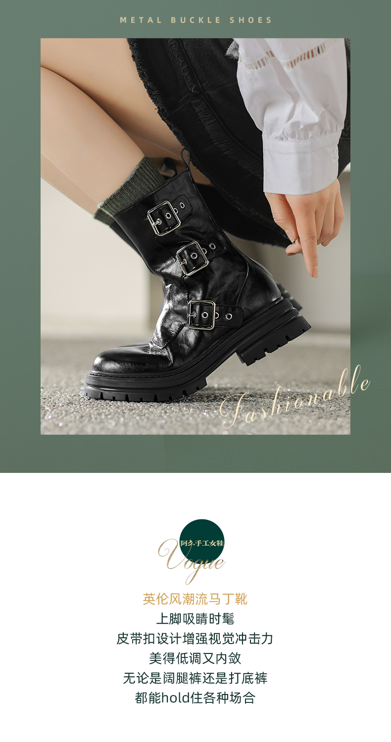 阿么手工女鞋皮带扣酷帅机车风短靴5CM潮流时尚骑士圆头厚底复古