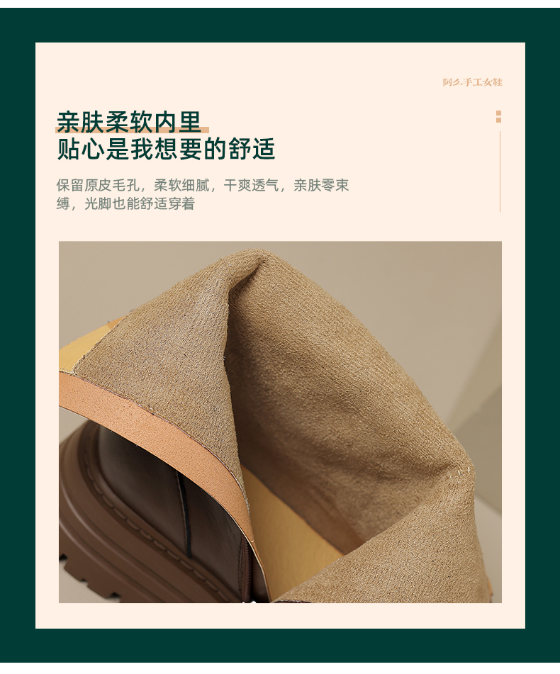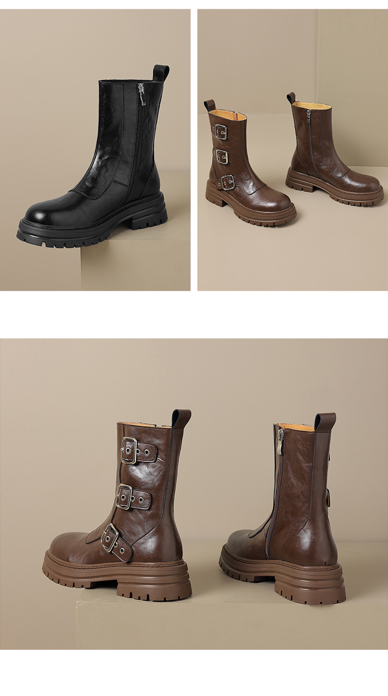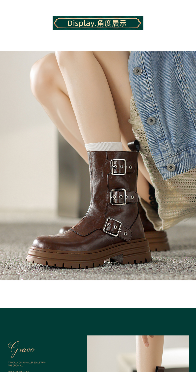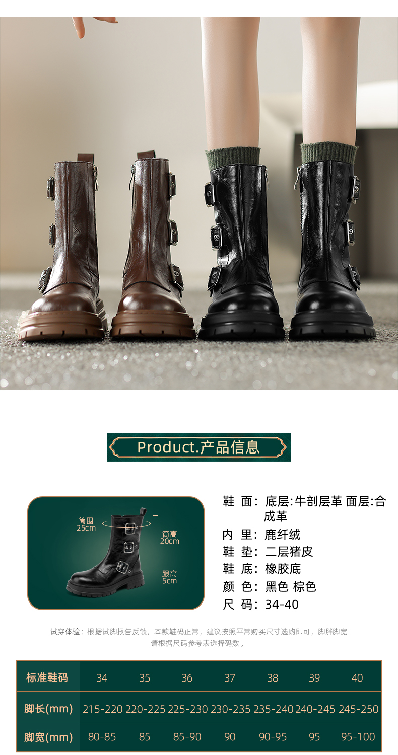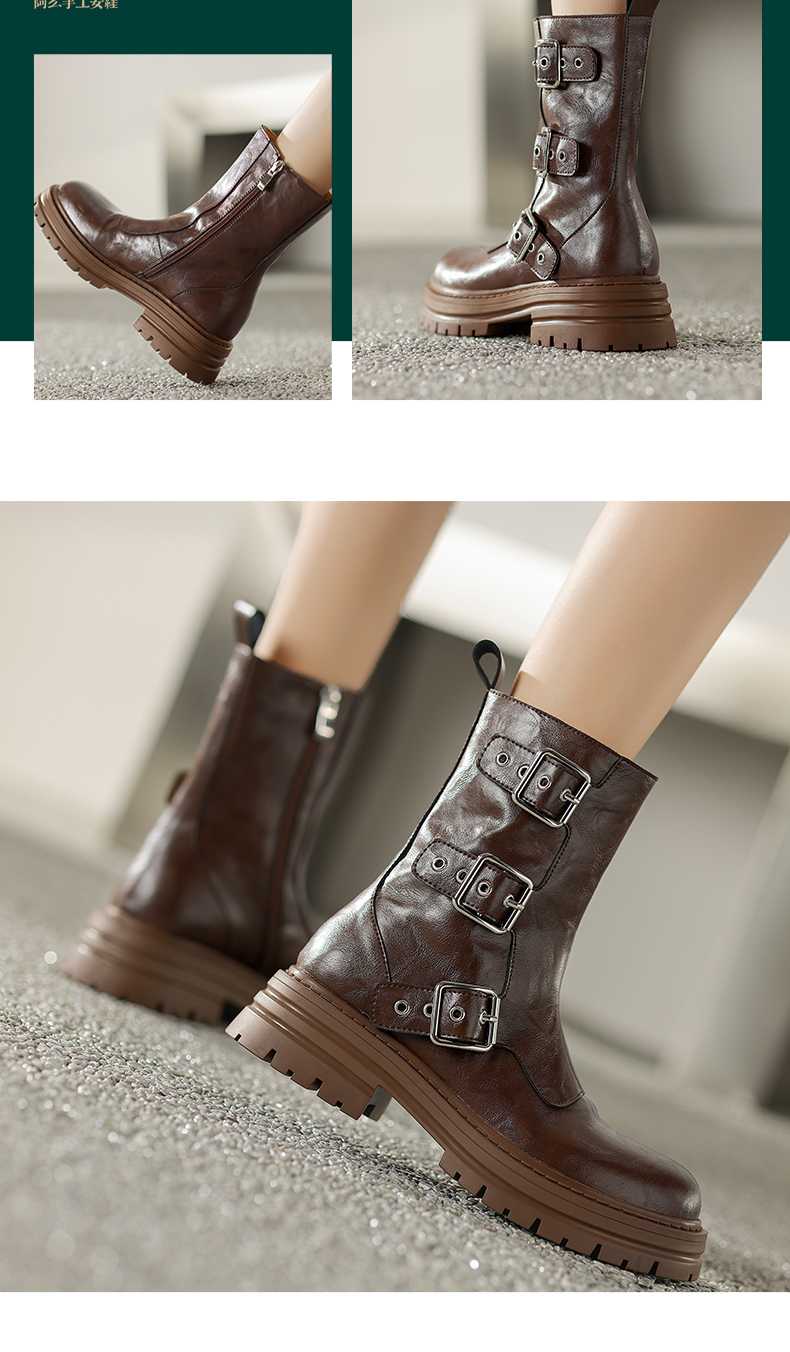 阿么手工女鞋皮带扣酷帅机车风短靴5CM潮流时尚骑士圆头厚底复古