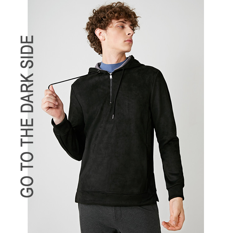 连帽卫衣半开套头衫!面料舒适微弹。有双侧兜。因出厂保护,领标和洗标剪标,介意的朋友请再考虑!部分帽绳不同随机发。M码重约680克。