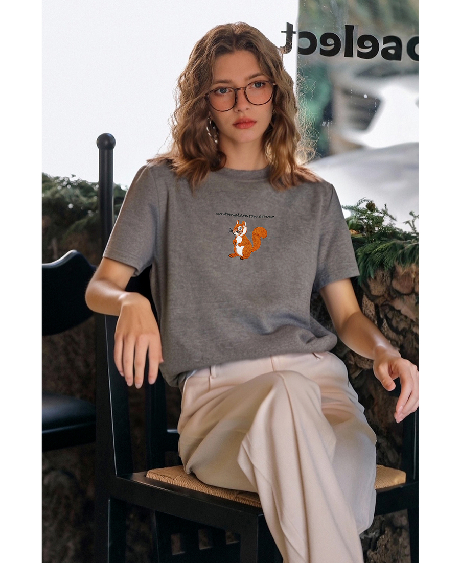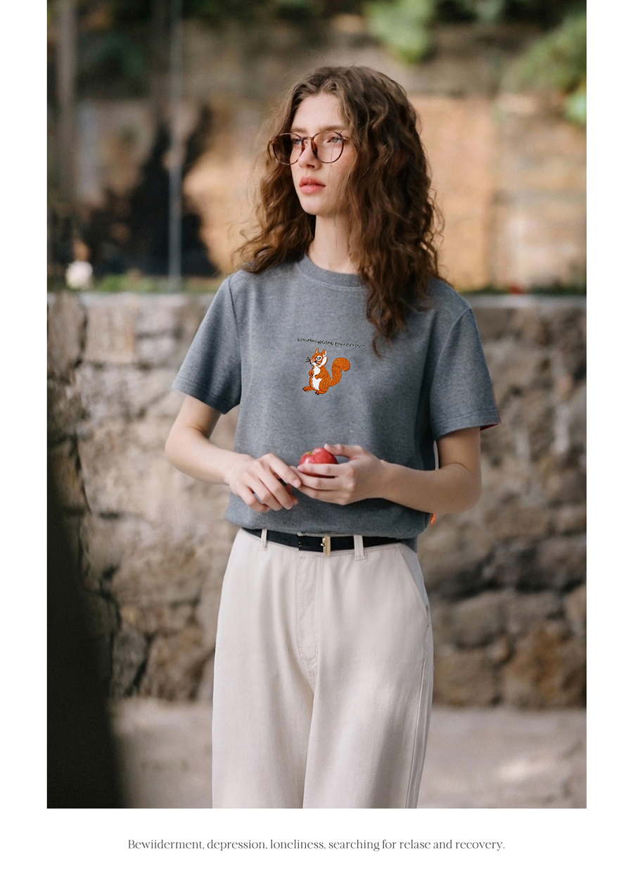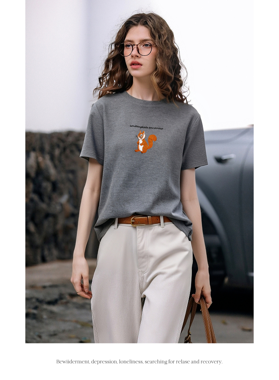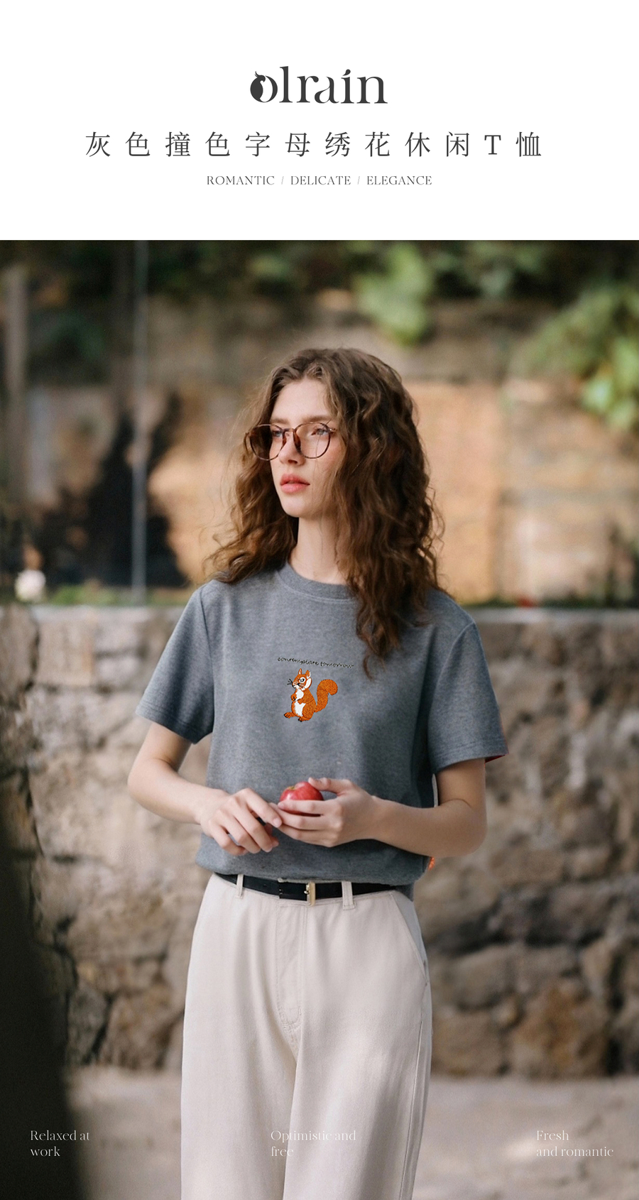 OLrain欧芮儿灰色撞色字母绣花休闲T恤夏季2025新款短袖百搭上衣