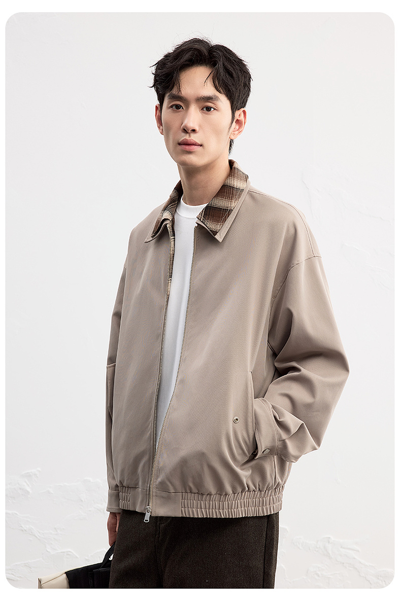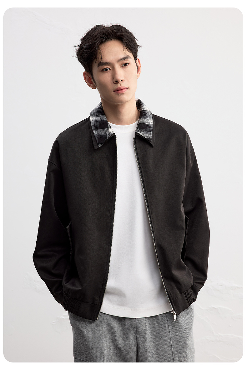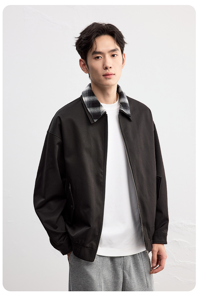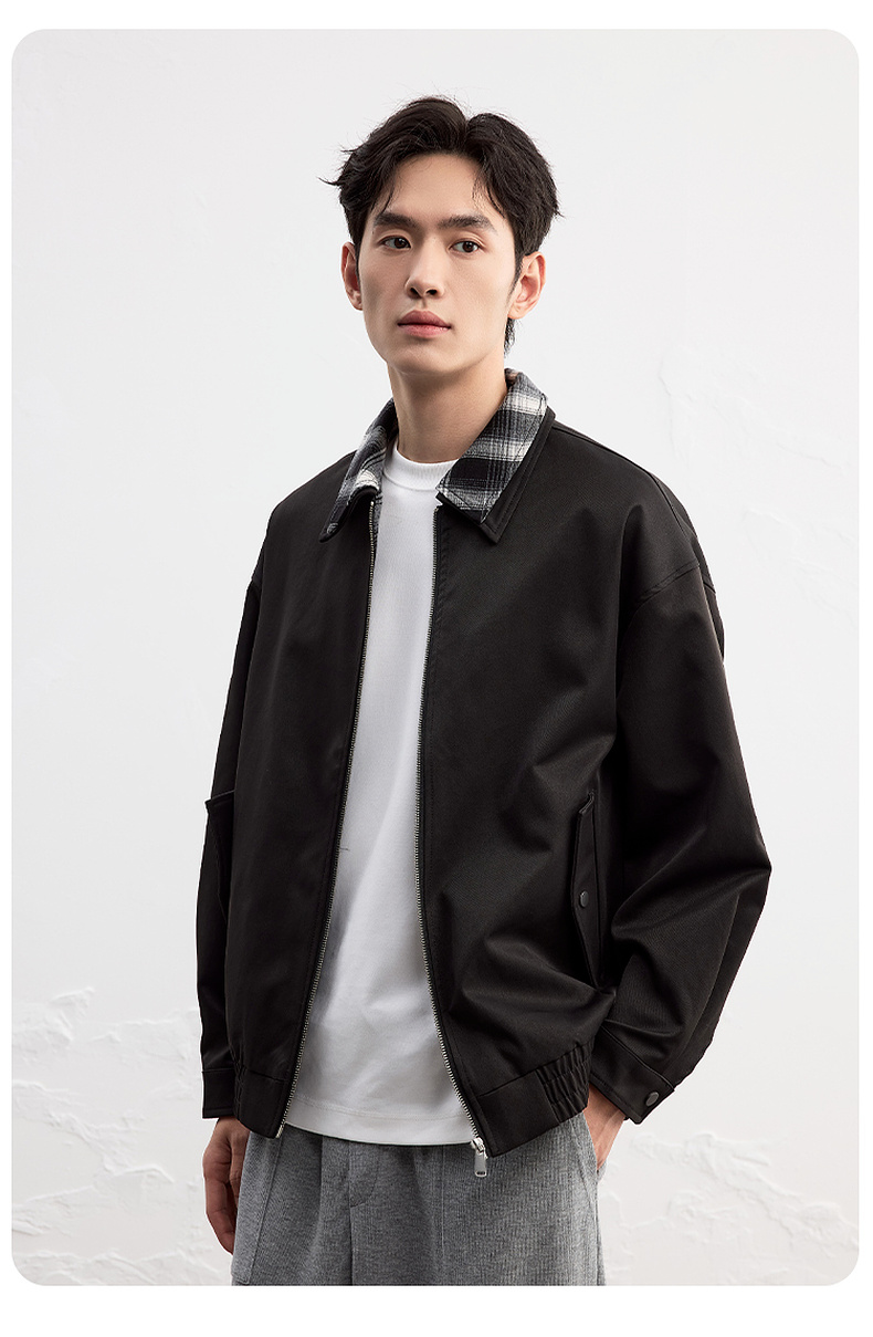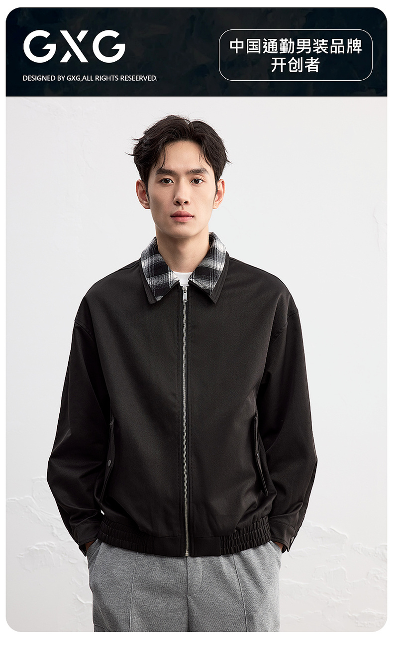 GXG男装25秋季时尚撞色格纹领口潮流宽松百搭休闲男式翻领夹克K&C