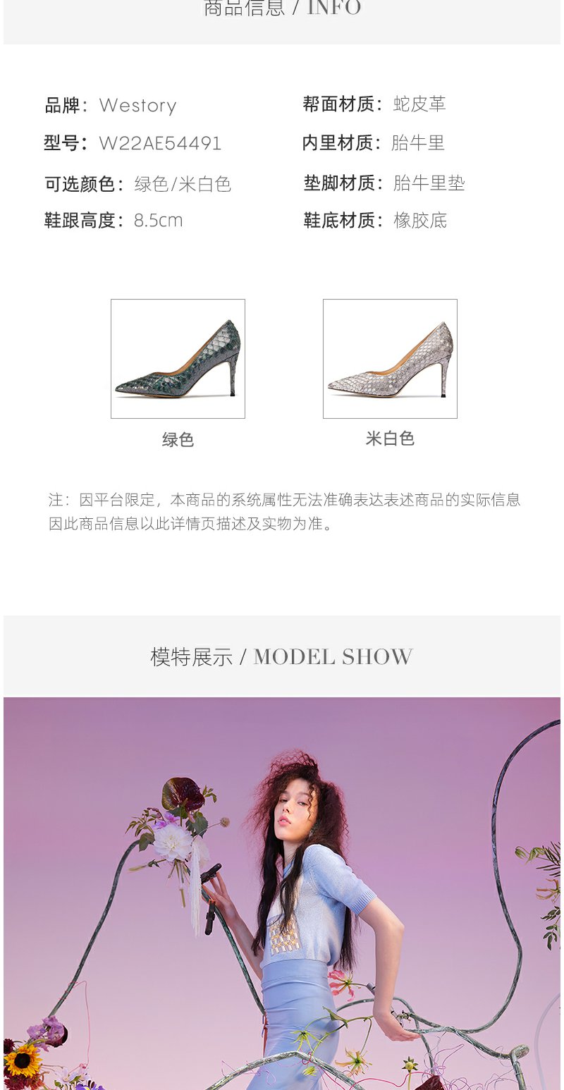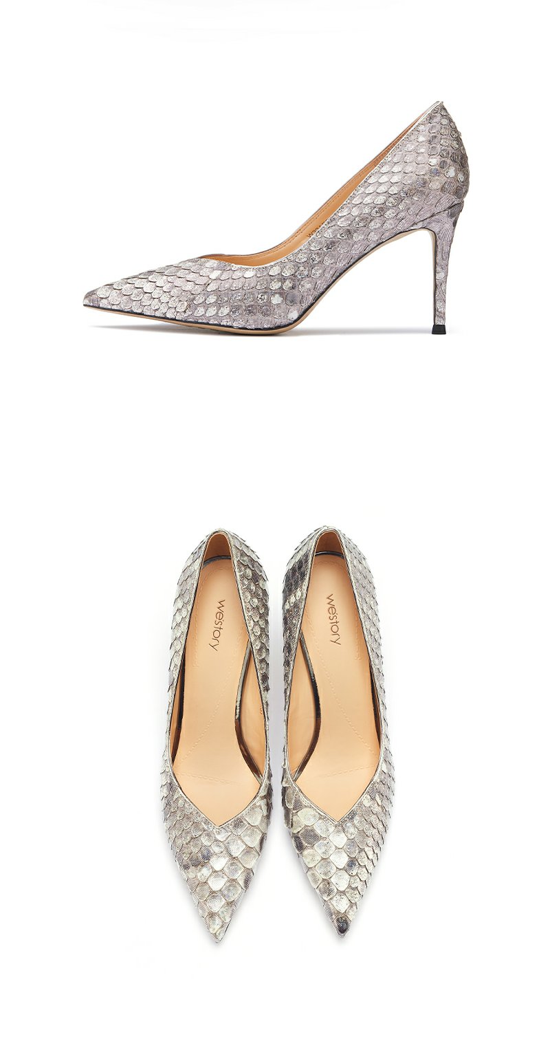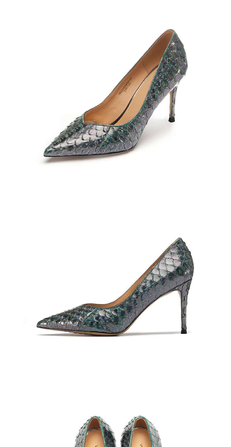 westory22年春季新款蛇皮高跟鞋真皮尖头欧美性感单鞋宴会W22AE54491