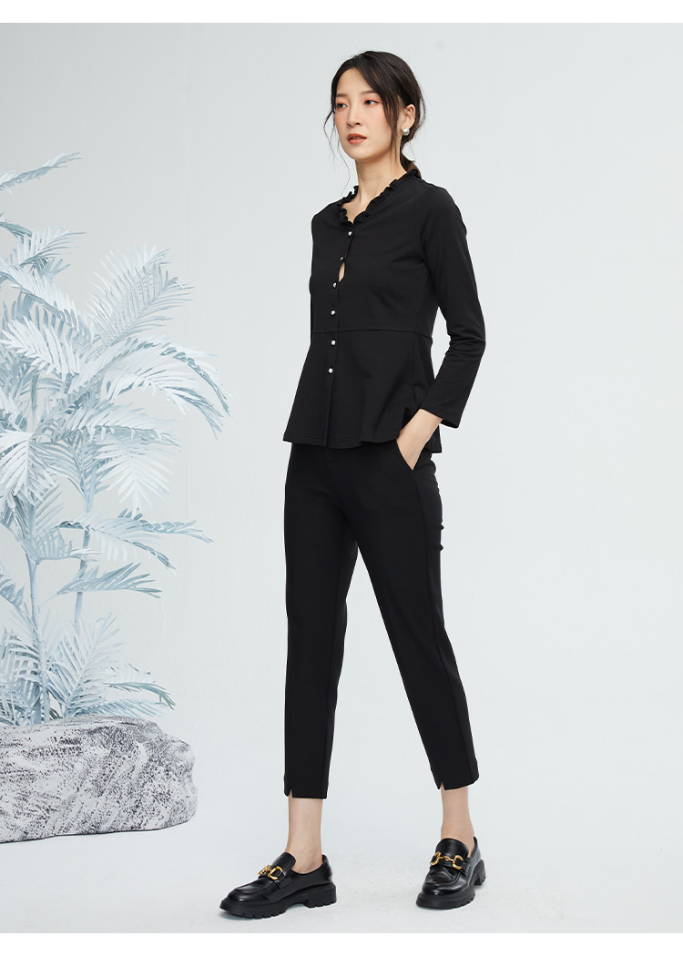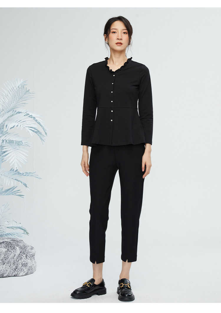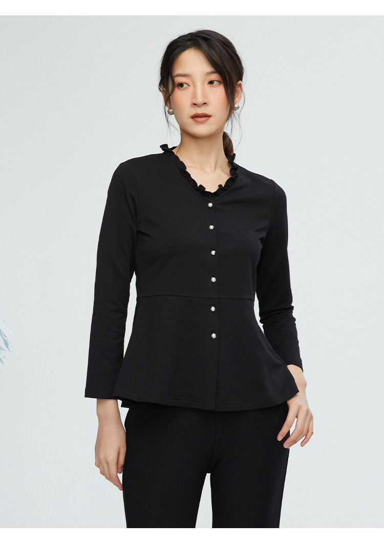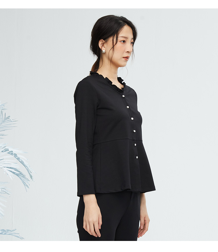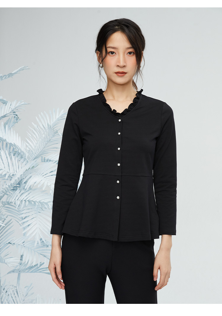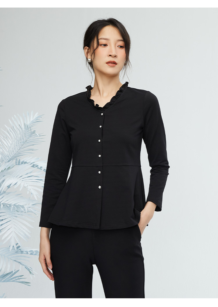 VIVIAN LIU R2443008初秋新款时尚小翻领不规则下摆开衫长袖上衣