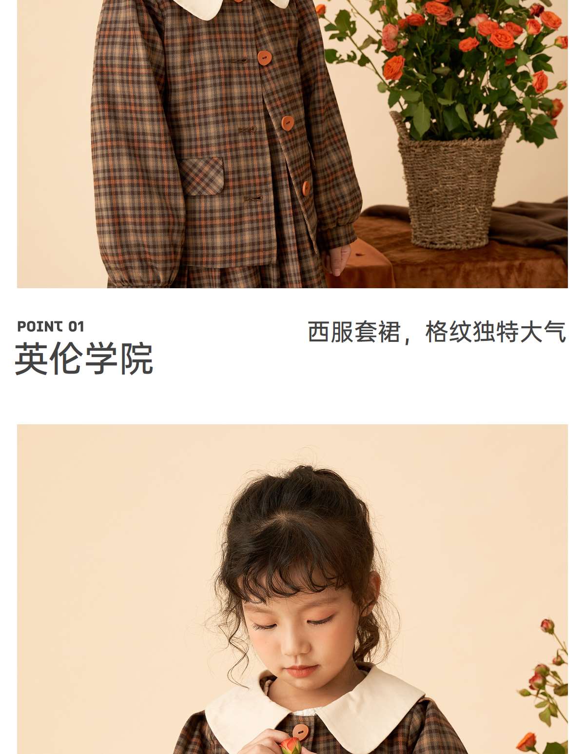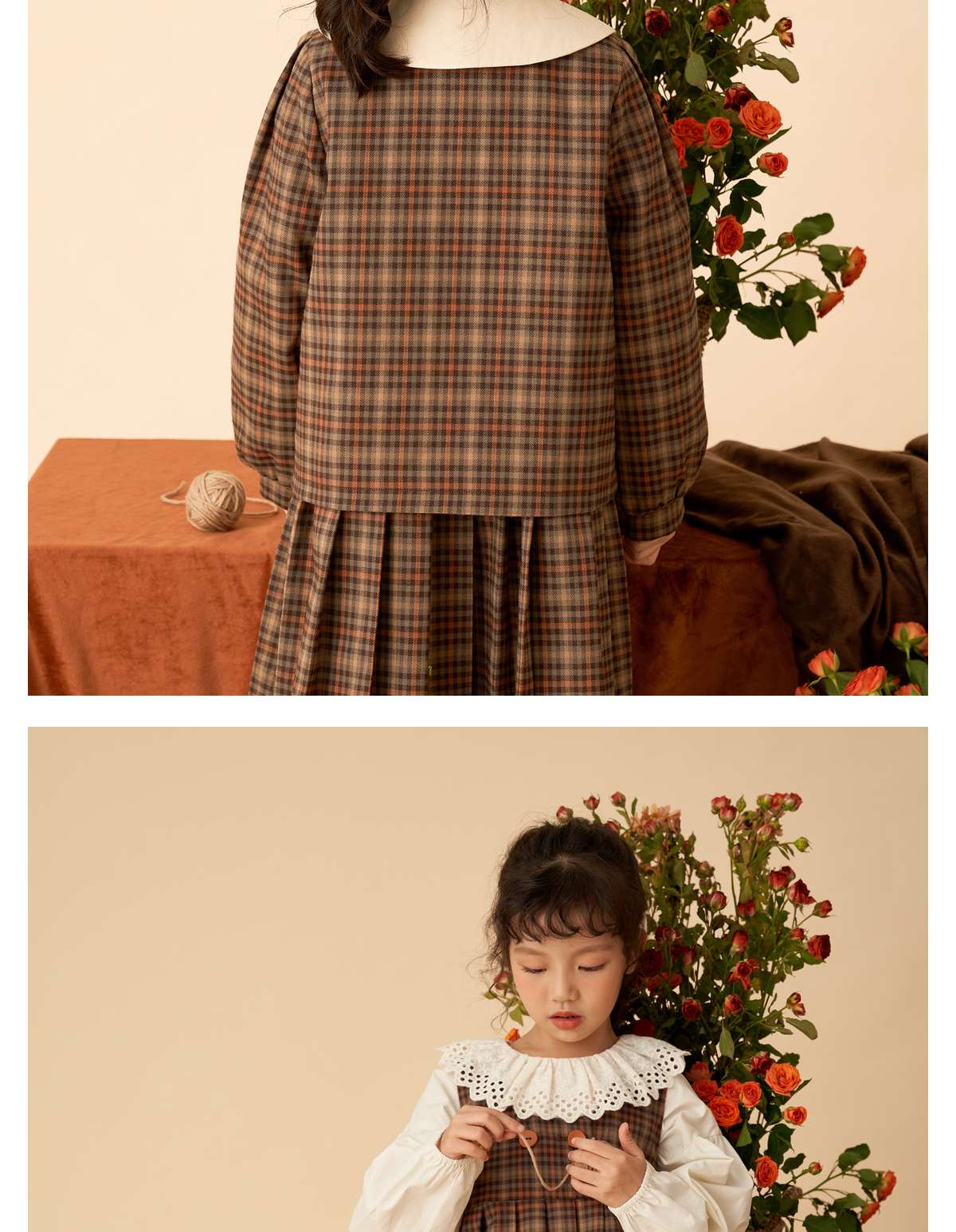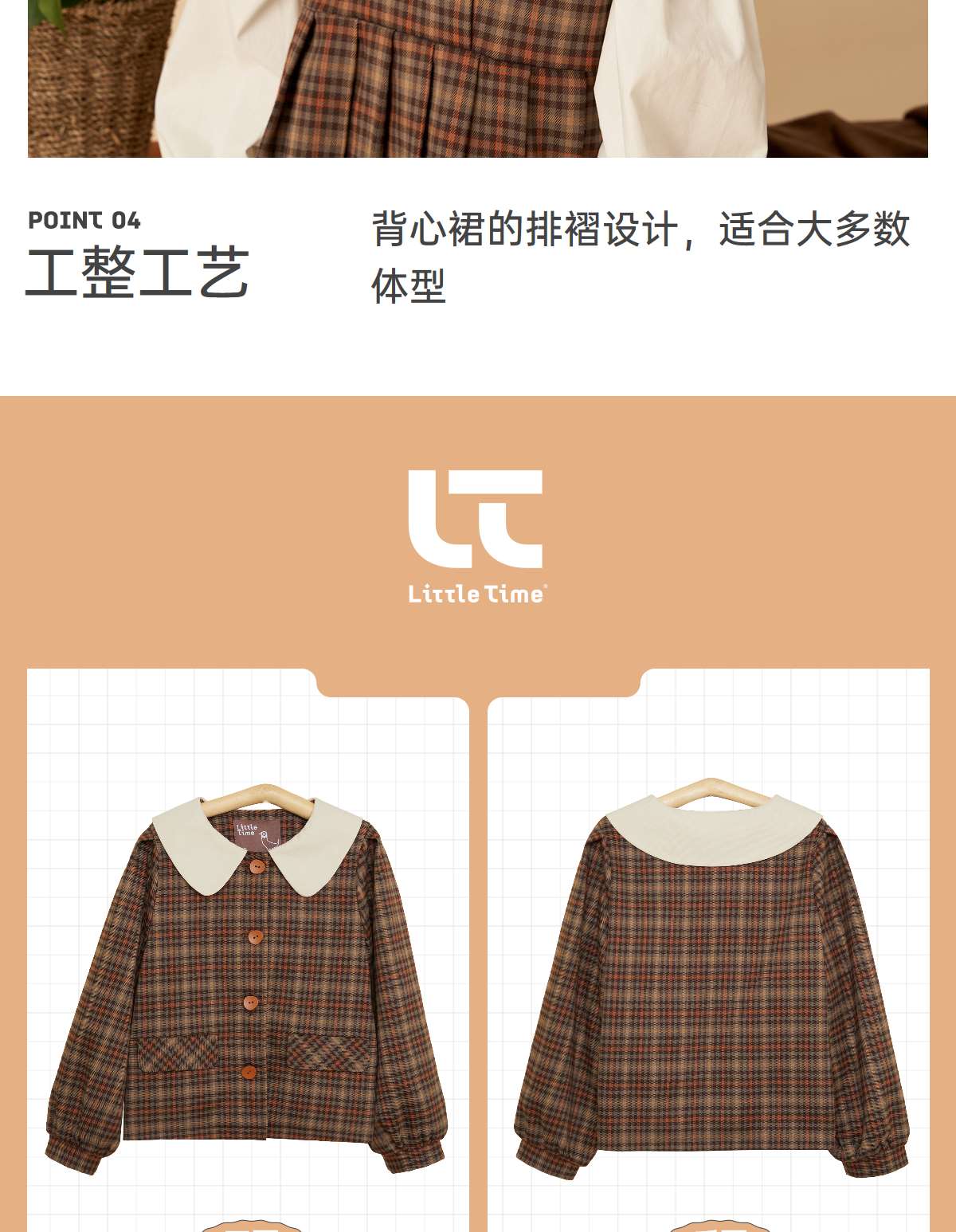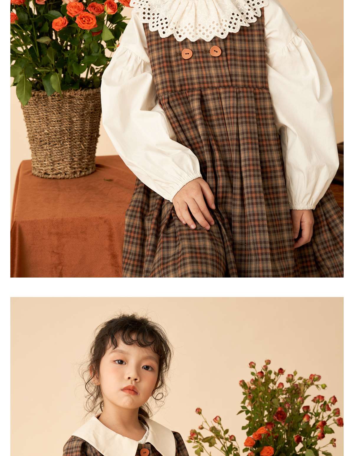littletime女童复古森系连衣裙套装2022女大童文艺格子开衫两件套