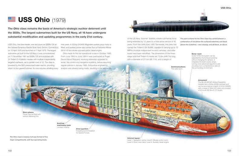 休萨托尼克号成为海军历史上头一艘被潜艇击沉的舰艇。 《潜艇大全》收录了历史上重要的潜艇,从1914年9月22日击沉三艘英国巡洋舰的德国U-9潜艇,到日本的大型I-400级潜艇,再到冷战时期的大型核动力潜艇,例如美国“洛杉矶”号和苏联“奥斯卡”级潜艇。此外,书中还收录了“水下巡洋舰”号“叙尔库夫”号、二战中战功赫赫的VII型U型潜艇,以及近期的攻击型和弹道导弹潜艇,例如英国皇家海军“机敏”号潜艇、美国“弗吉尼亚”号潜艇、中国094型潜艇和俄罗斯“白蜡树”级潜艇。