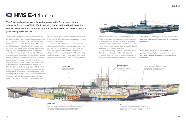 Each entry includes a brief description of the submarine’s development and history, a colour profile or cutaway, key features and specifications. Packed with more than 200 artworks and photographs, Submarines is an accessible guide for those interested in naval history.