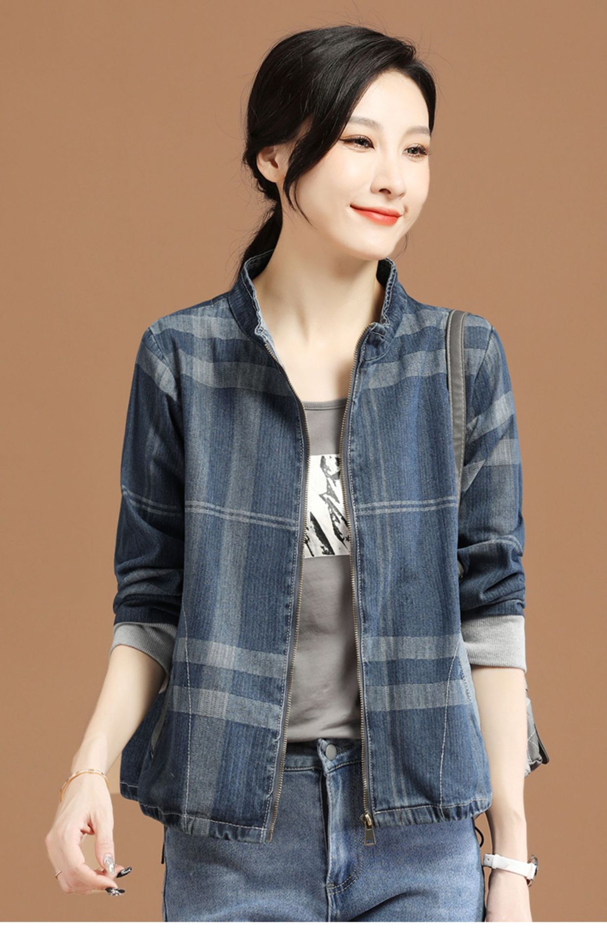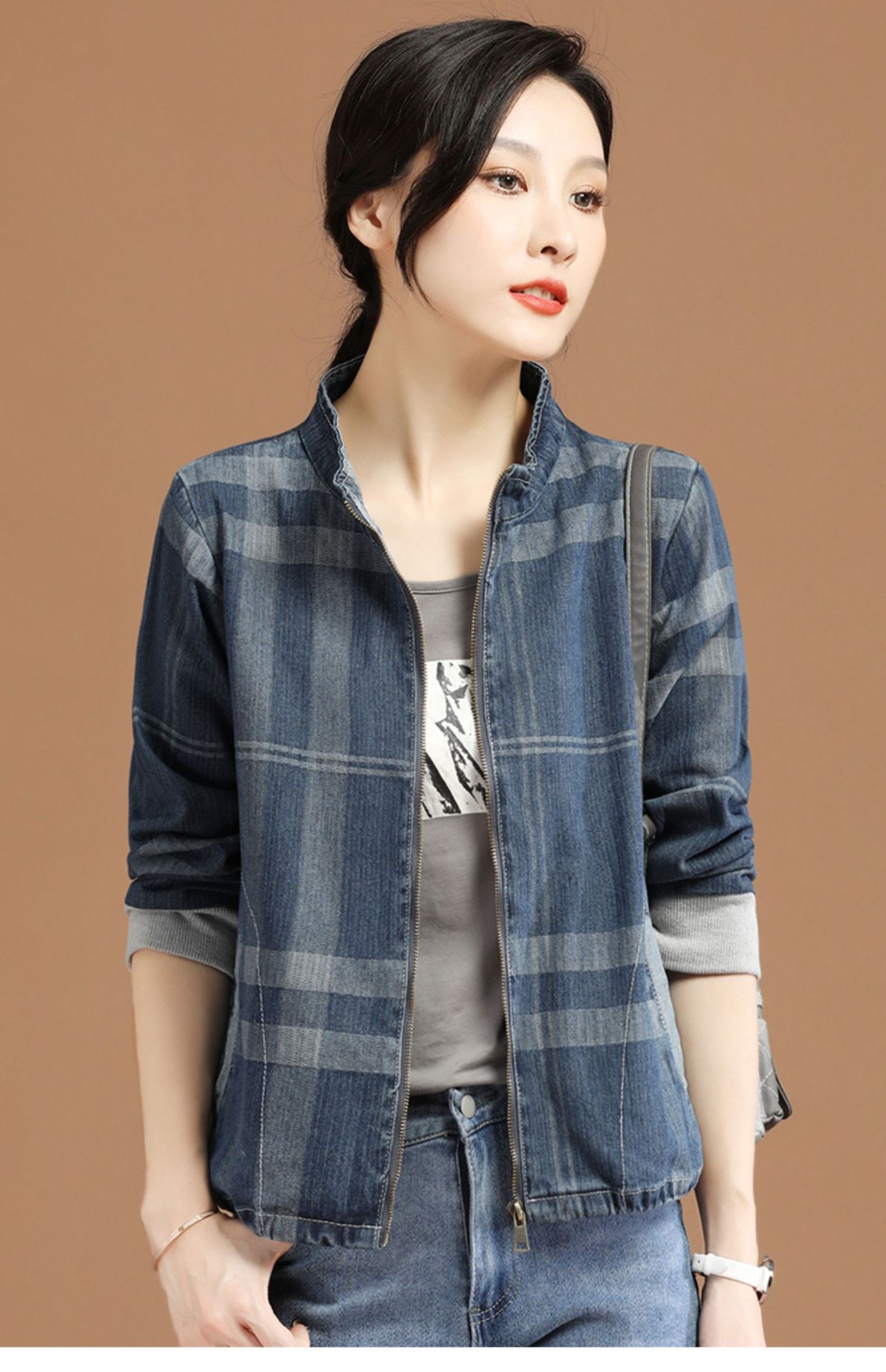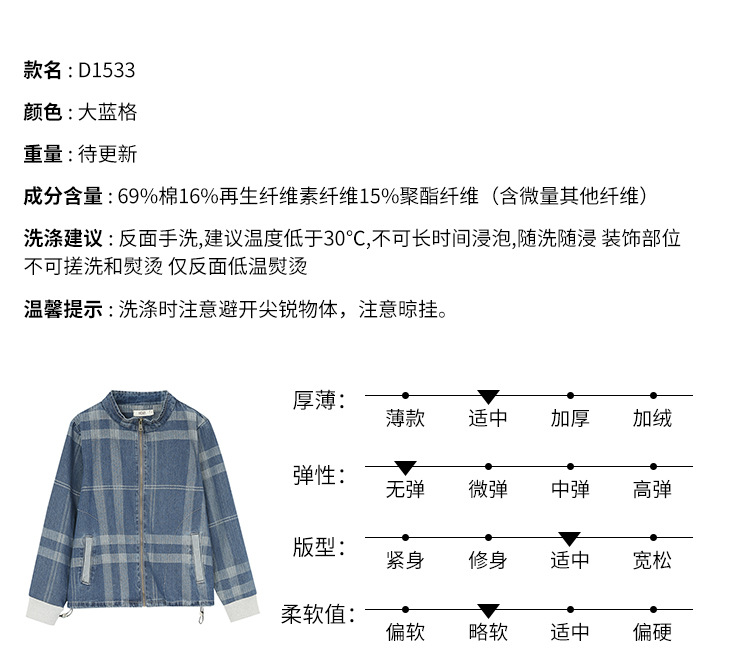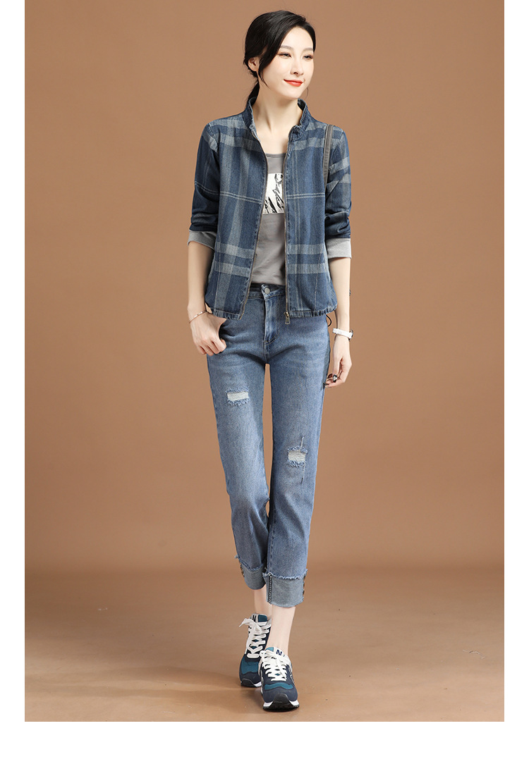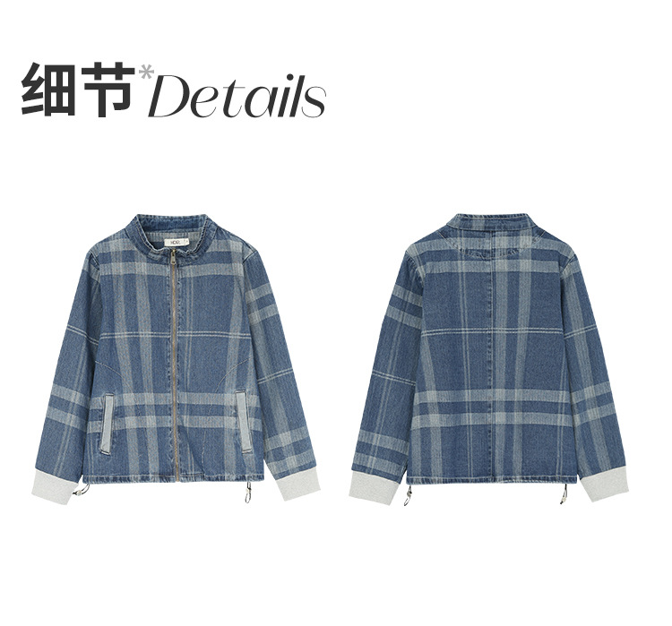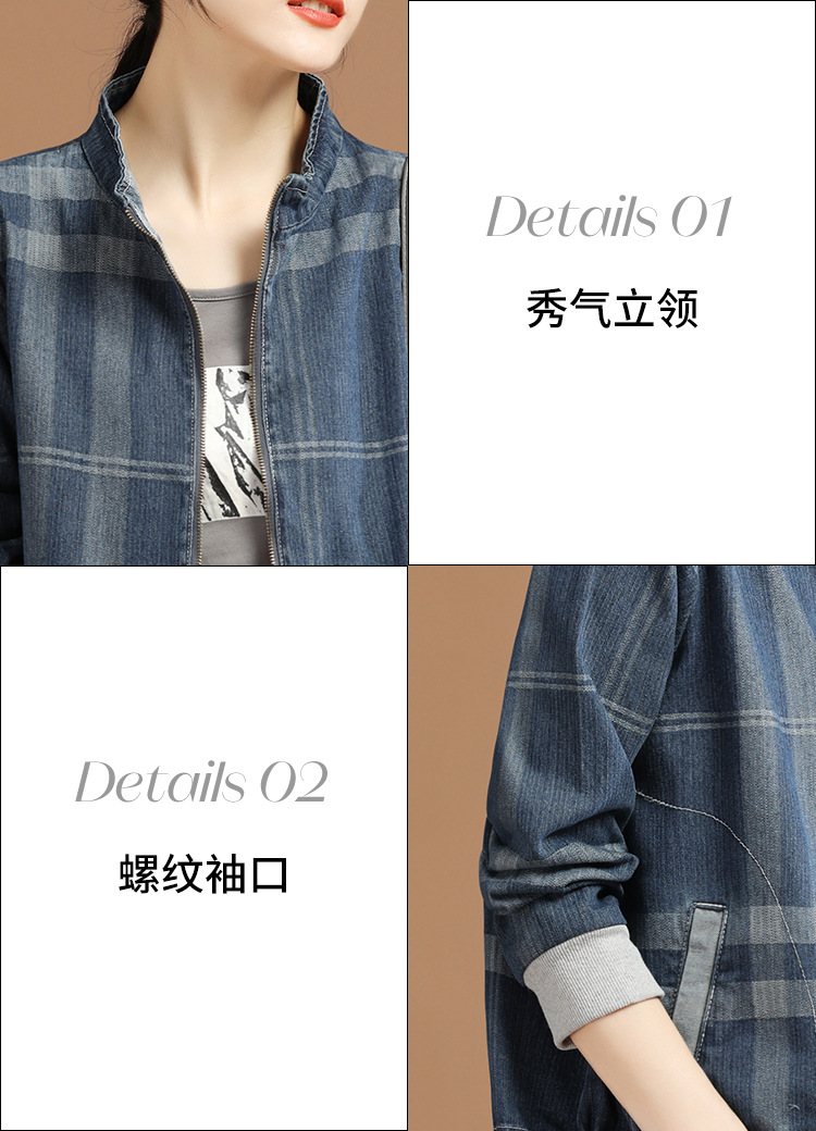 立领格子百搭牛仔外套女2022年春装新款韩版休闲短款棒球服 GYM-D1533