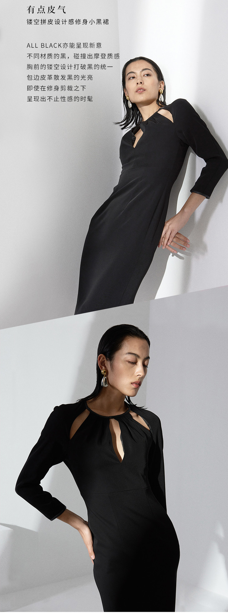 【有点皮气】镂空拼皮设计感修身小黑裙