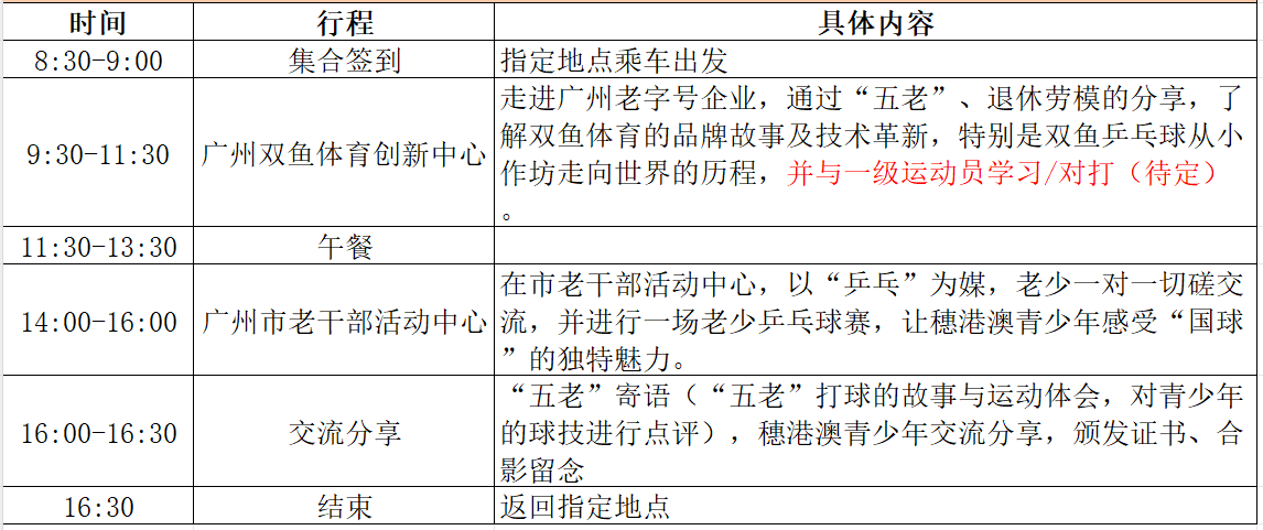 走进广州老字号企业,了解双鱼体育的品牌故事及技术革新,特别是双鱼乒乓球从小作坊走向世界的历程,同时以“乒乓”为媒,“五老”与穗港澳青少年进行一场代际体育交流,让青少年感受“国球”的独特魅力,鼓励青少年积极参加体育运动,护航青少年健康成长。