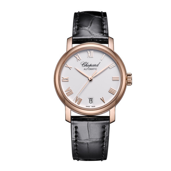 镜面材质 | 蓝宝石水晶玻璃 | 表盘 | 18K玫瑰金表壳 白色表盘,18K玫瑰金罗马数字时标 指针 日期显示 密底 |