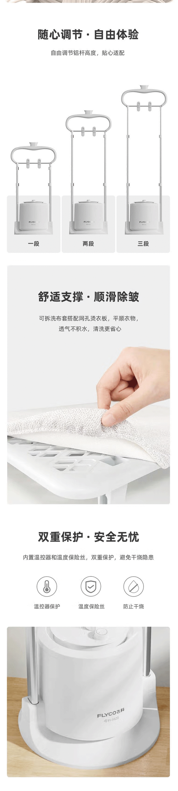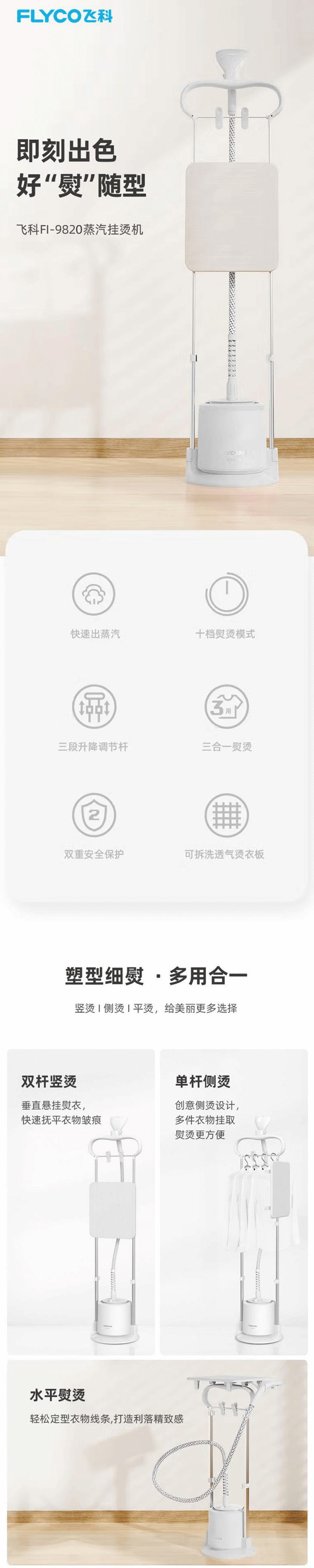 飞科(509624)(FLYCO)挂烫机FI9820蒸汽挂烫机 家用挂式带熨烫板衣架带可调节双支撑杆