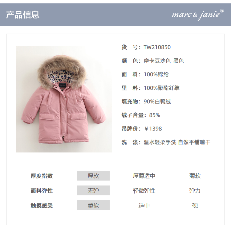 马克珍妮新款冬装 男女童儿童户外防寒中长款羽绒服 210850
