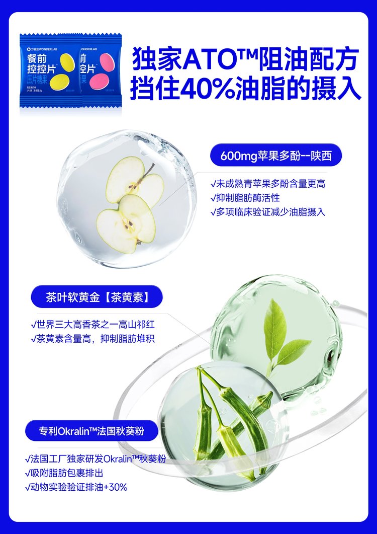 万益蓝新品餐前控控片最厉害的是✅添加了ATO专业独家阻油配方👉苹果多酚+茶黄素+法国秋葵粉能够阻断40%的油脂,减少肠道吸收油脂