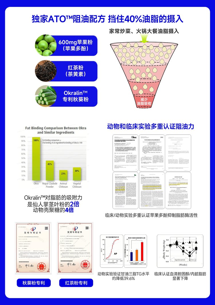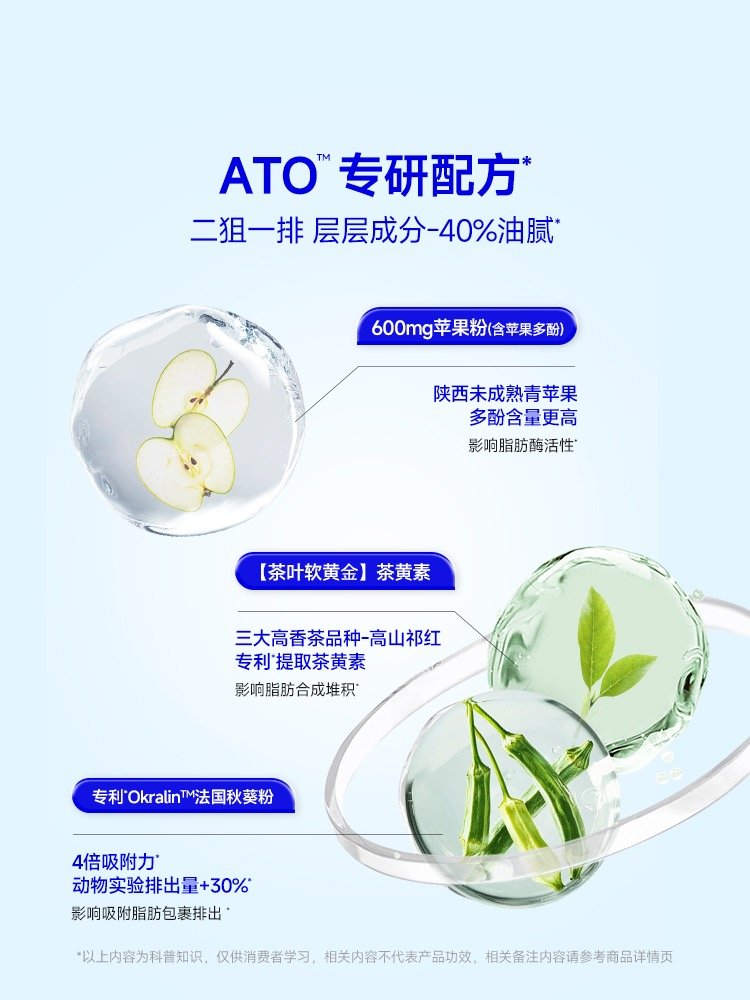 ✅独家ATO专业阻油配方!苹果多酚+茶黄素减少油脂吸收,减少脂肪堆积,法国秋葵粉吸附油脂促进排出,油腻不停留!